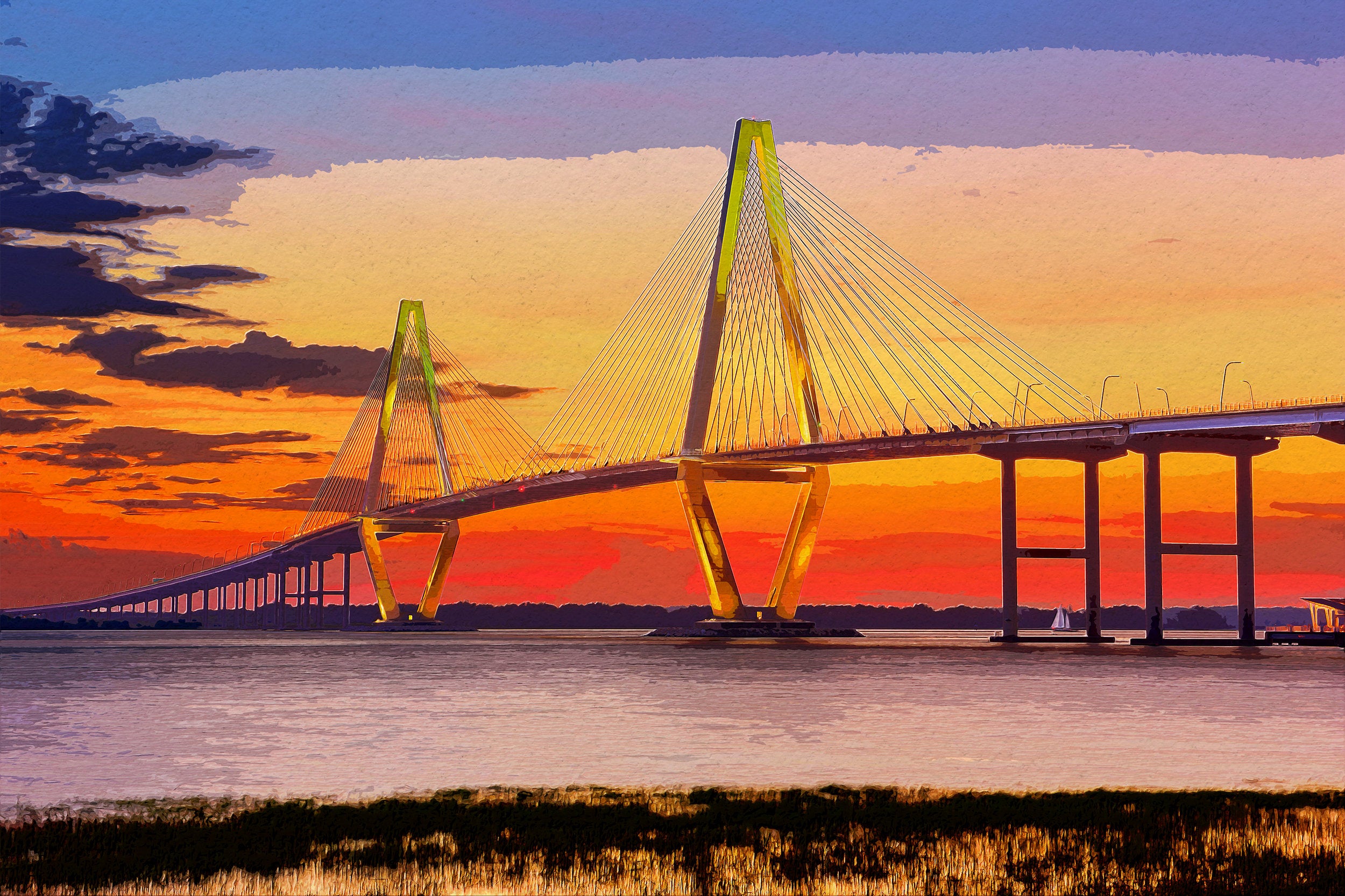 Stunning Watercolor of the Arthur Ravenel Bridge in Charleston. Great for a piece of wall art. Available as a single canvas at 16″ x 24″ , 24″ x 36″. or 32 x 48 Ravenel Bridge watercolor