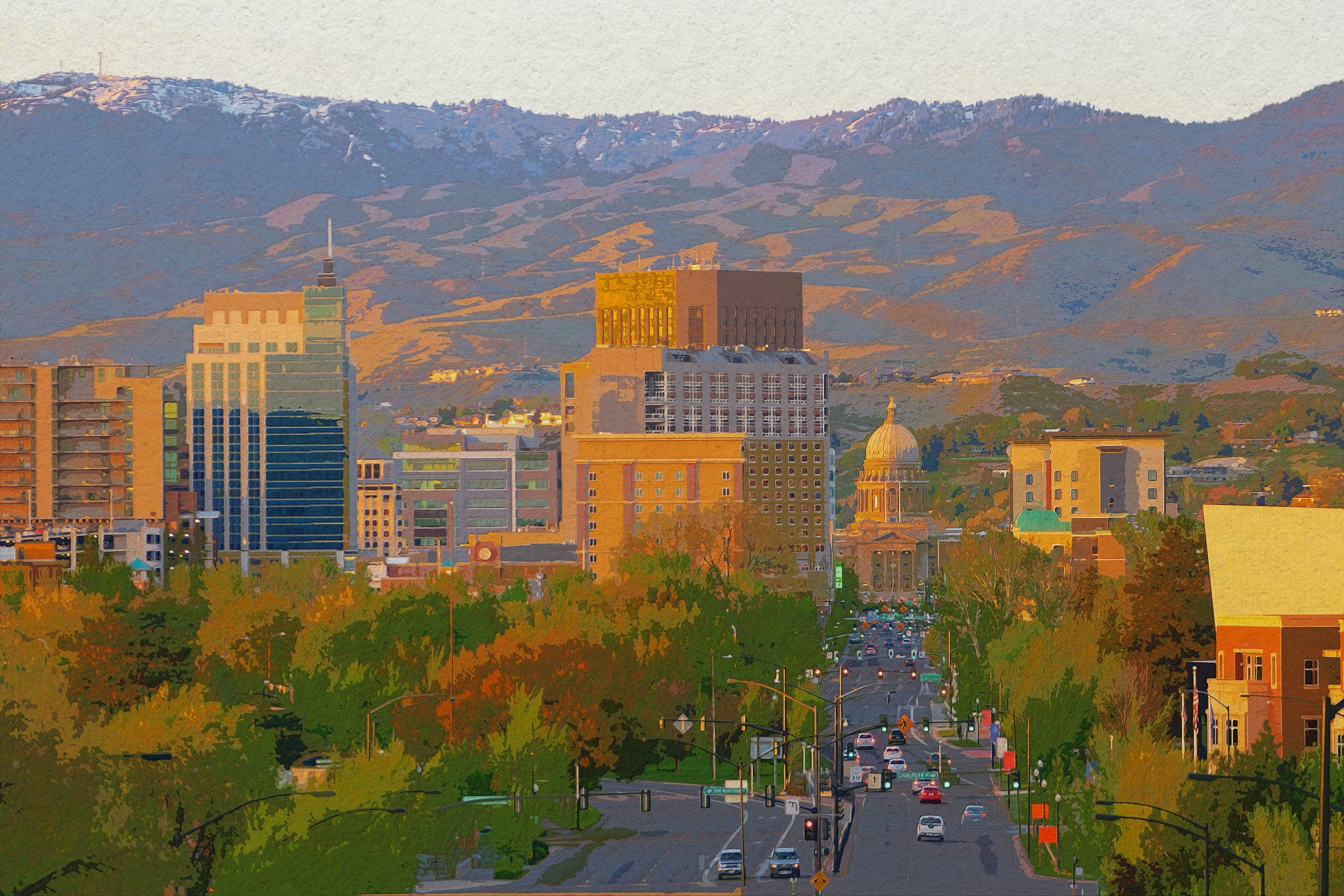 The beautiful watercolor of Boise Idaho on canvas framed and ready to hang. Stunning colors that make for the perfect wall decor. Boise watercolor