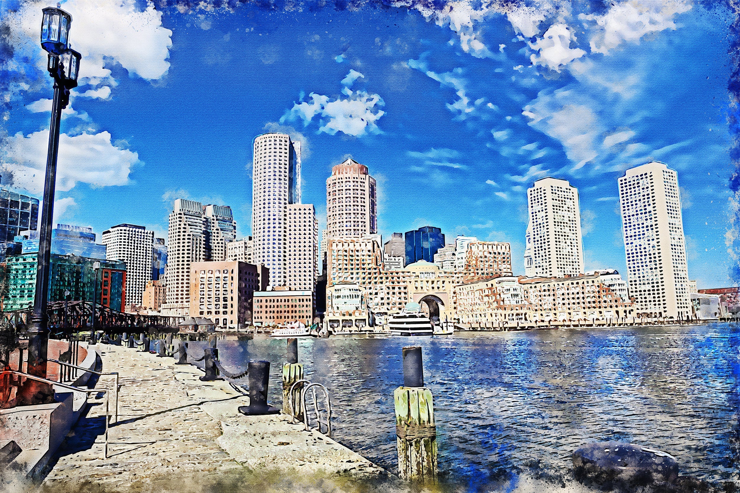 Beautiful watercolor photo of Boston. Great colors! Available as a SINGLE canvas at 16″ x 24″ , 24″ x 36″ , or 32″ x 48″ or we can make you a special 3 panel work of art as large as 4 x 8 foot wideor get the digital file and you can print it yourself. ( Digital File only, no product included)