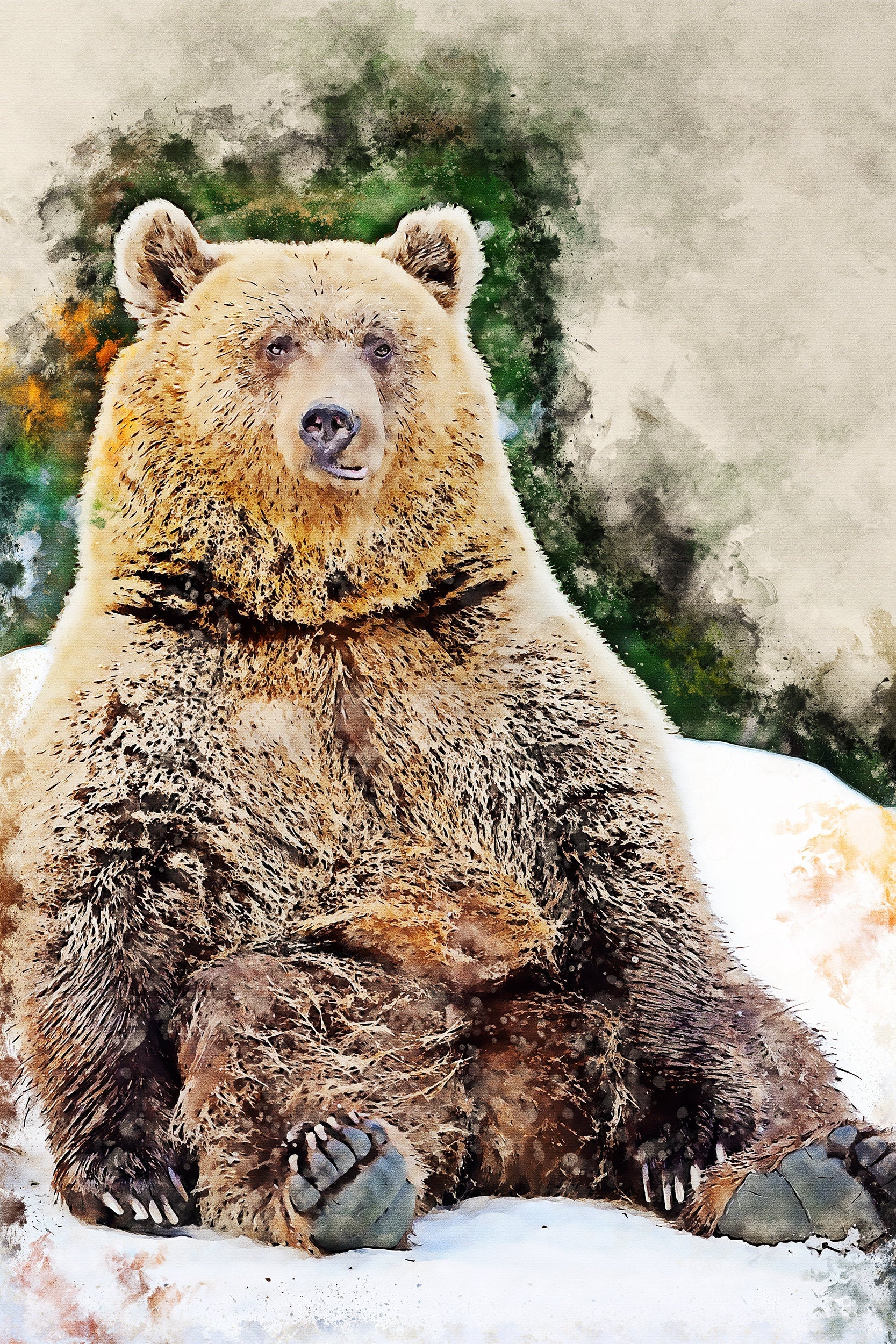 Lovely watercolor of a Brown Bear. Perfect wildlife wall art Great for a piece of wall art. Available as a single canvas at 16″ x 24″ , 24″ x 36″ , or 32″ x 48″ or a digital download and you can print it your self. (no physical product sent) Brown Bear watercolot