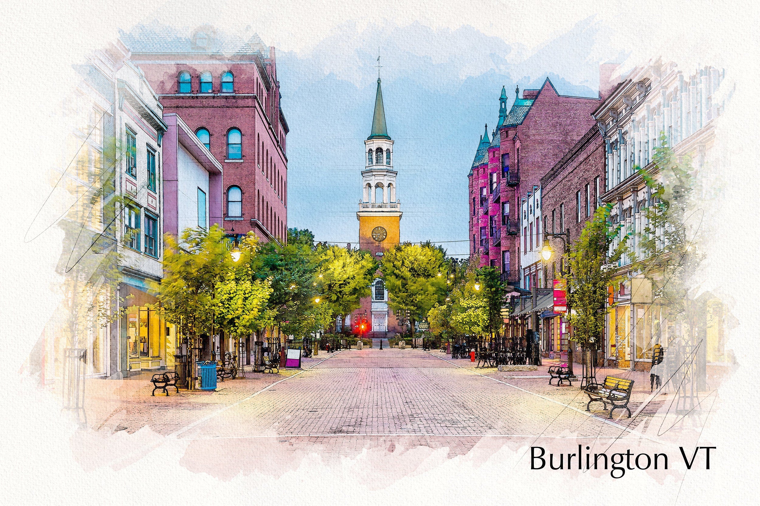Lovely Street watercolor in Burlington Vermont on canvas framed and ready to hang. Stunning colors that make for the perfect wall decor. Burlington Vermont watercolor canvas