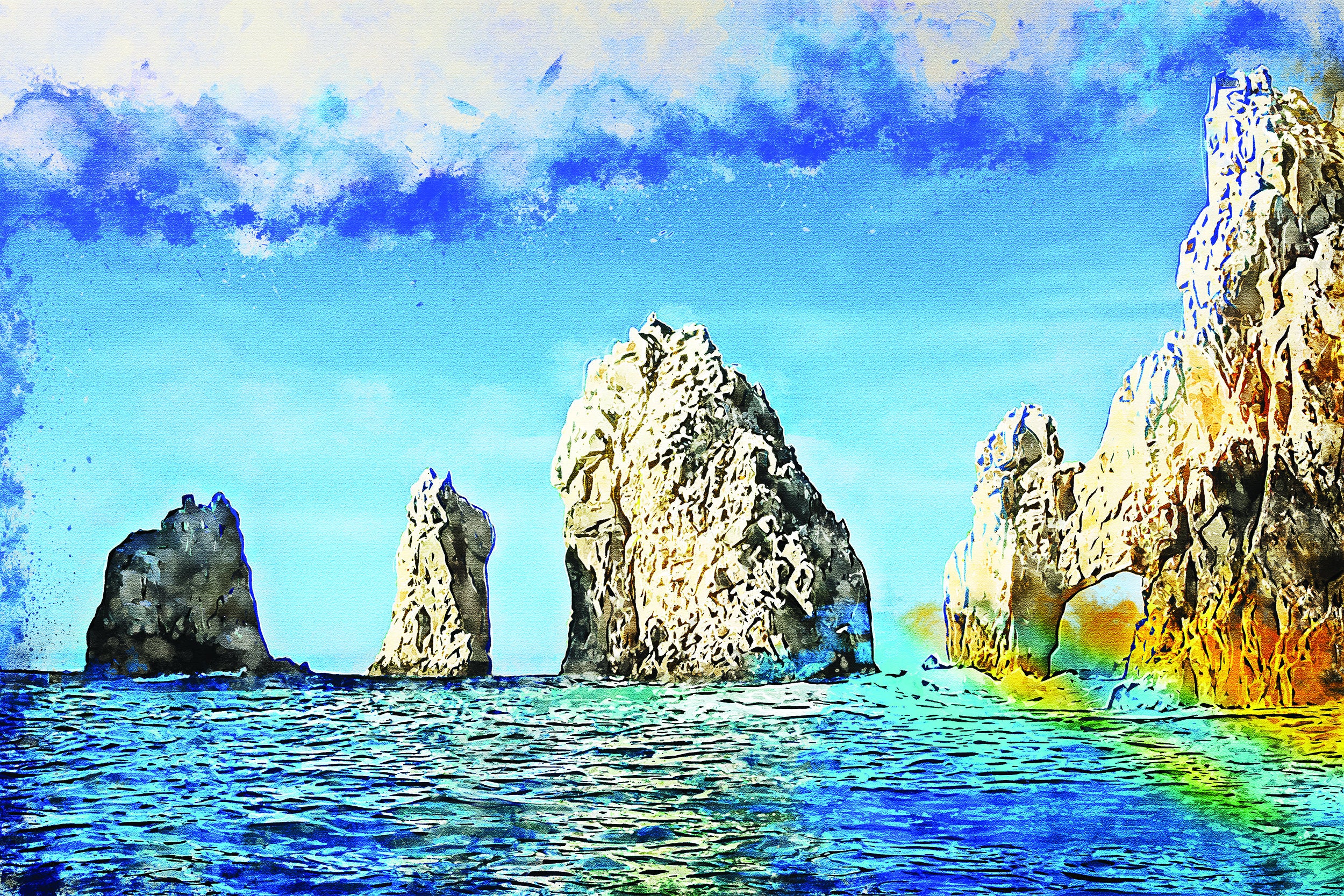 Lovely watercolor of Cabo San Lucas Cabo San Lucas watercolor Taken from Baker beach Great for a piece of wall art. Available as a single canvas at 16″ x 24″ , 24″ x 36″ , or 32″ x 48″ or we can make you a special 3 panel work of art as large as 4 x 8 foot wide. If ordering the digital download, no product is sent, just the image file