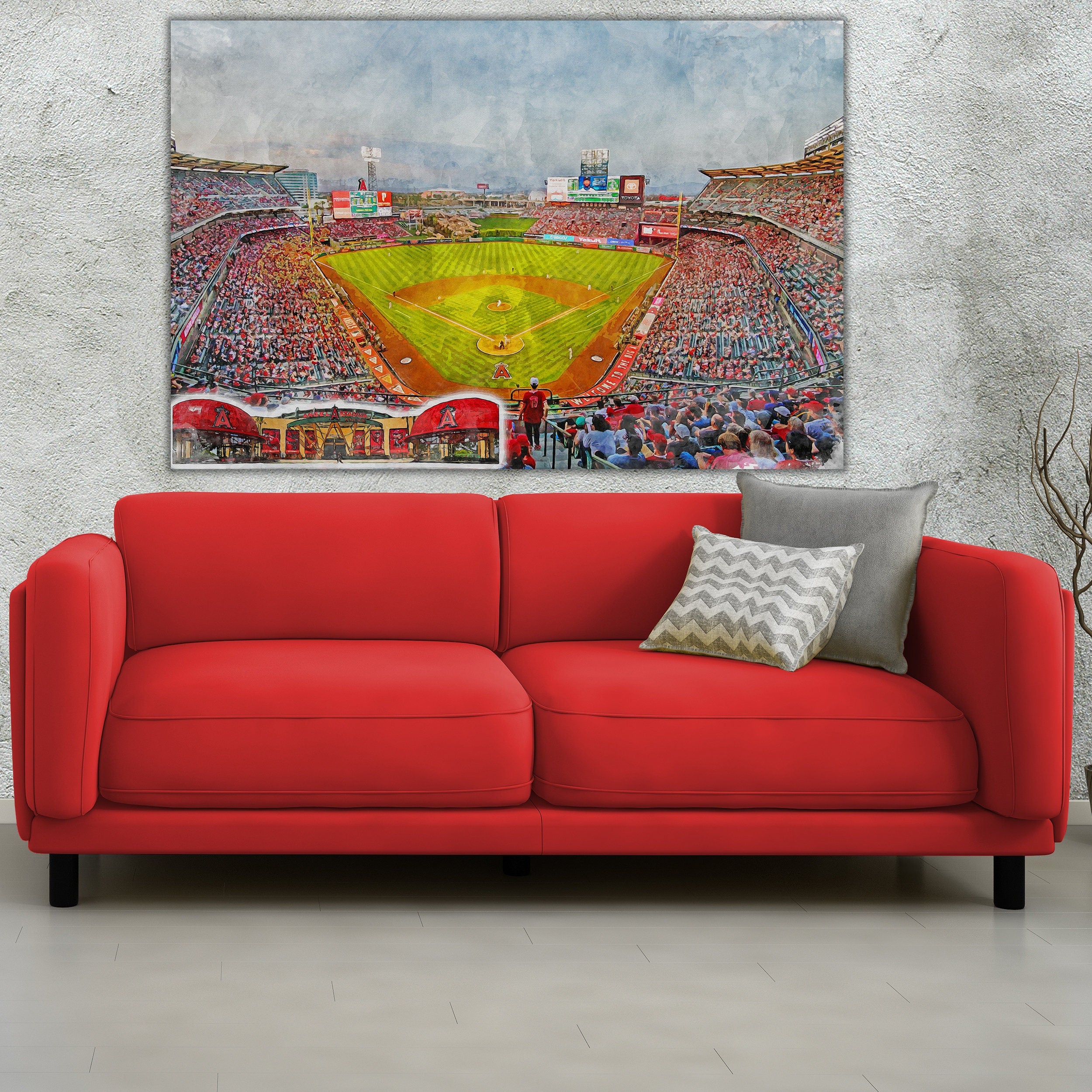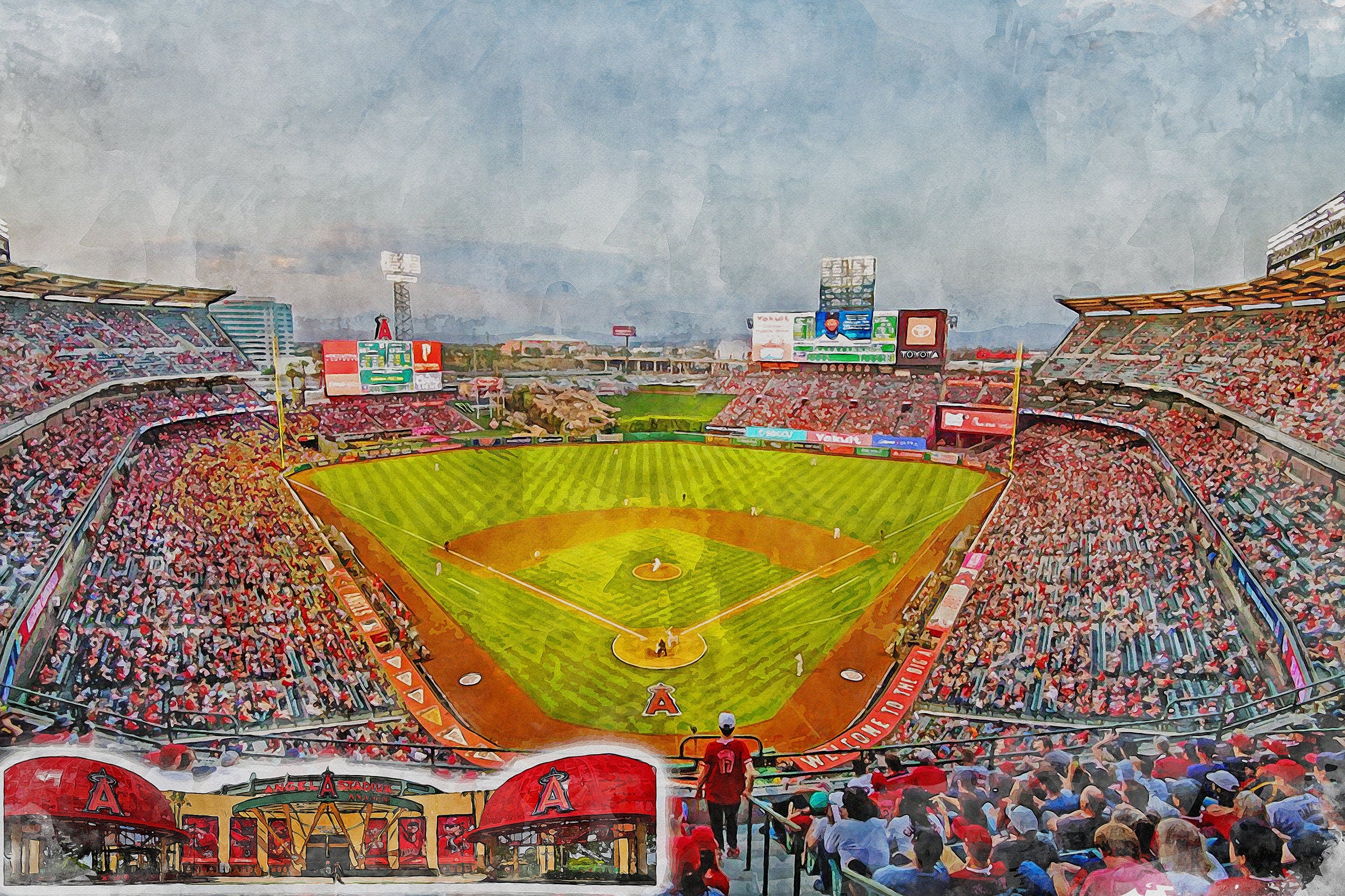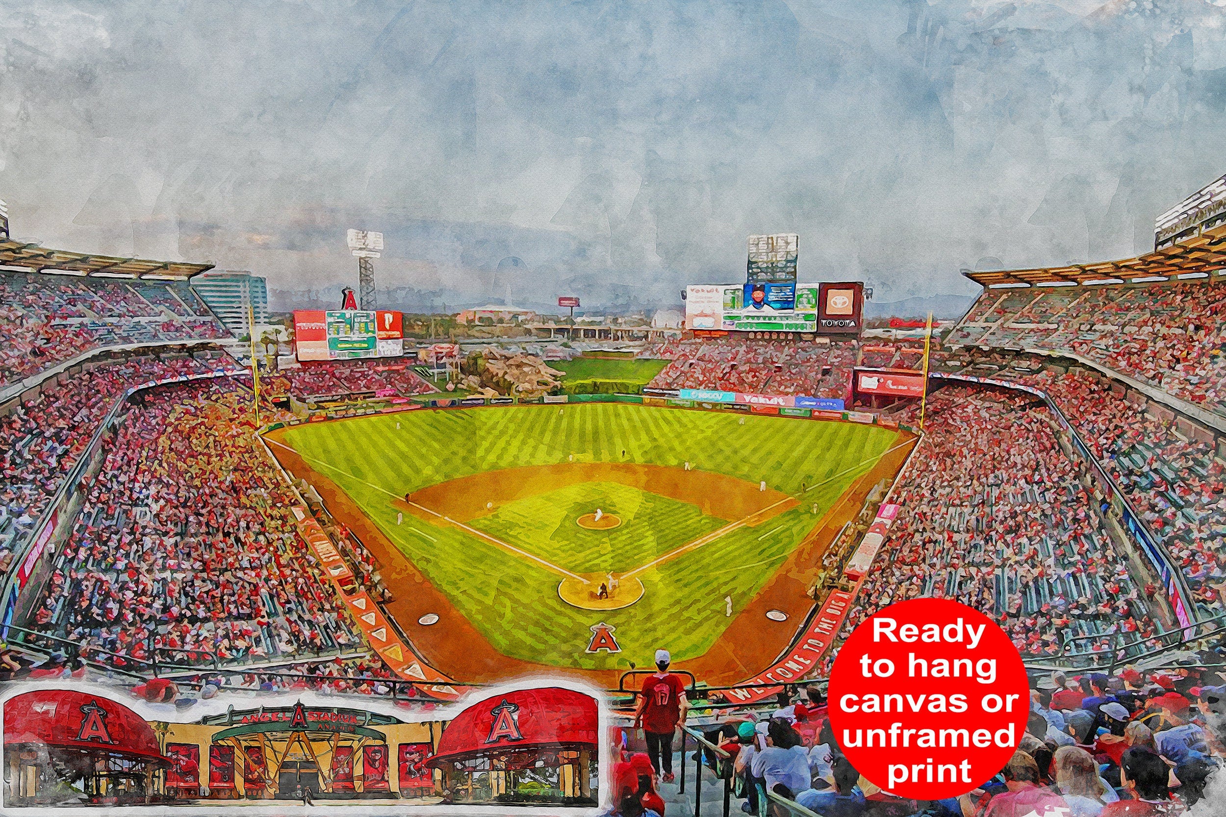 Beautiful watercolor print of Angel Stadium in Los Angeles California . WE GO HUGE!! Not some itty-bitty sign, Our signs are as large as 2 x 3 FEET!