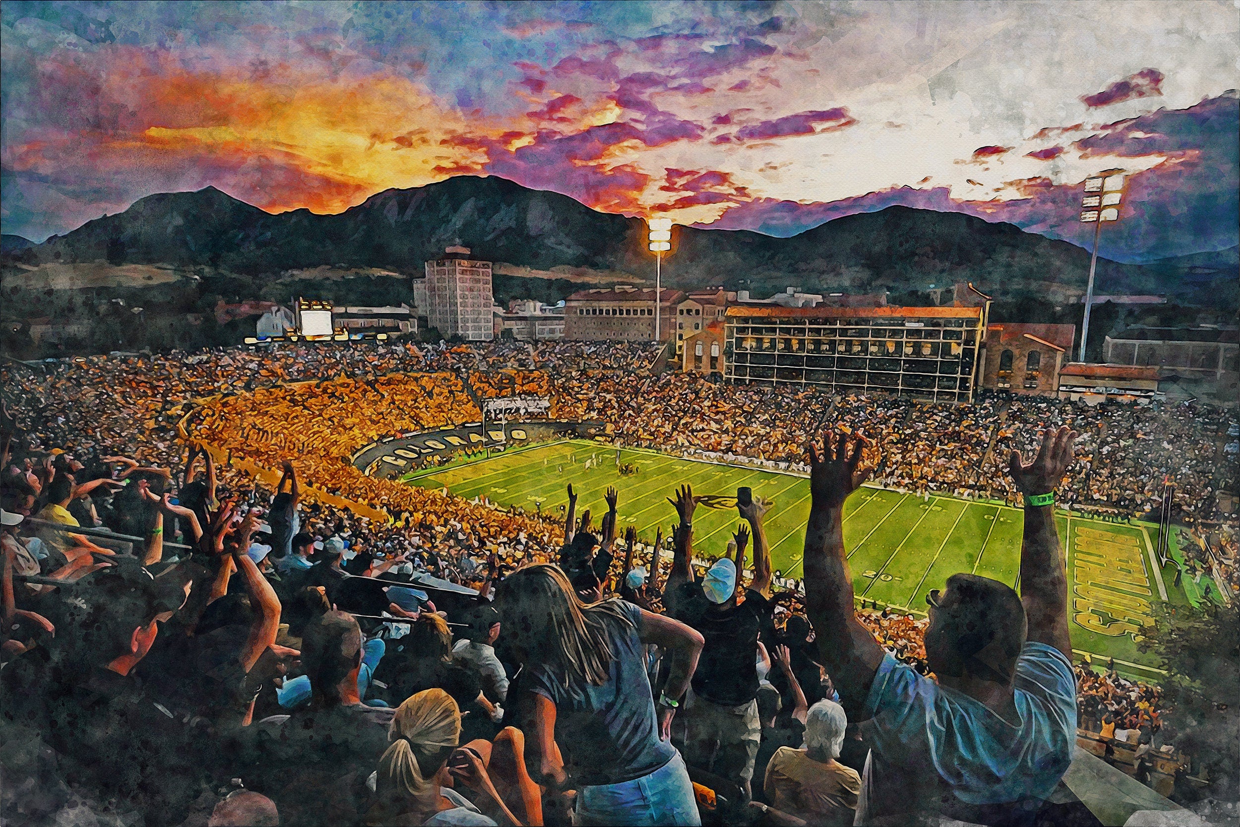 Beautiful Digital watercolor of Folsom Field in Boulder Colorado