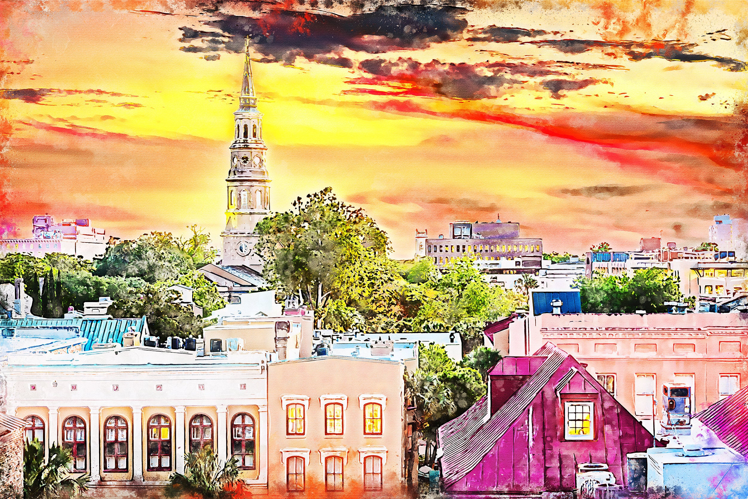 Charleston South Carolina watercolor on Canvas. Charleston South Carolina Print Great for a piece of wall art. Available as a single canvas at 16″ x 24″ , 24″ x 36″ , or 32″ x 48″ or we can make you a special 3 panel work of art as large as 4 x 8 foot wide. Charleston watercolor