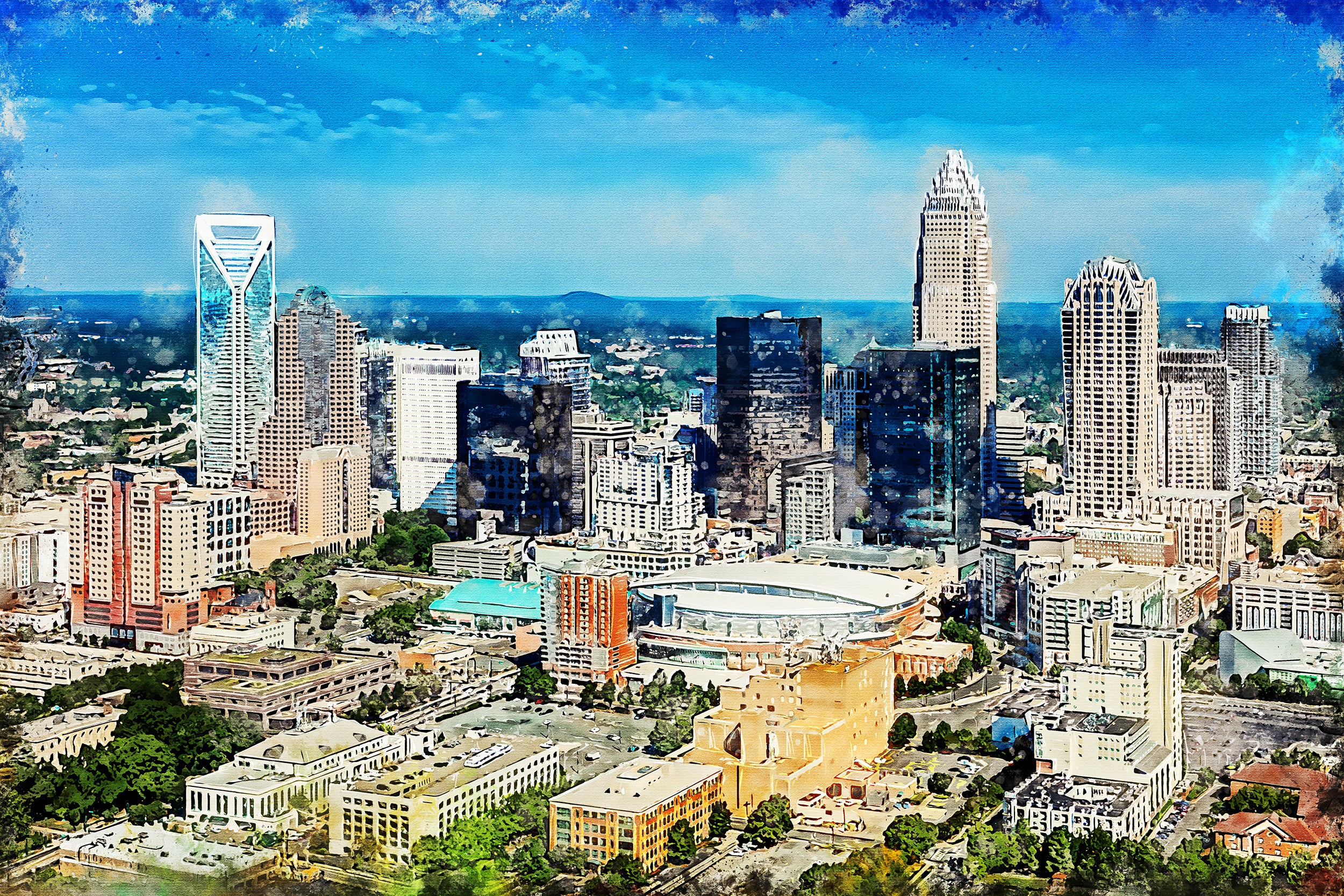 Stunning of the watercolor Charlotte skyline. Great for a piece of wall art. Available as a single canvas at 16″ x 24″ , 24″ x 36″ , or 32″ x 48″ or we can make you a special 3 panel work of art as large as 4 x 8 foot wide. Watercolor Charlotte