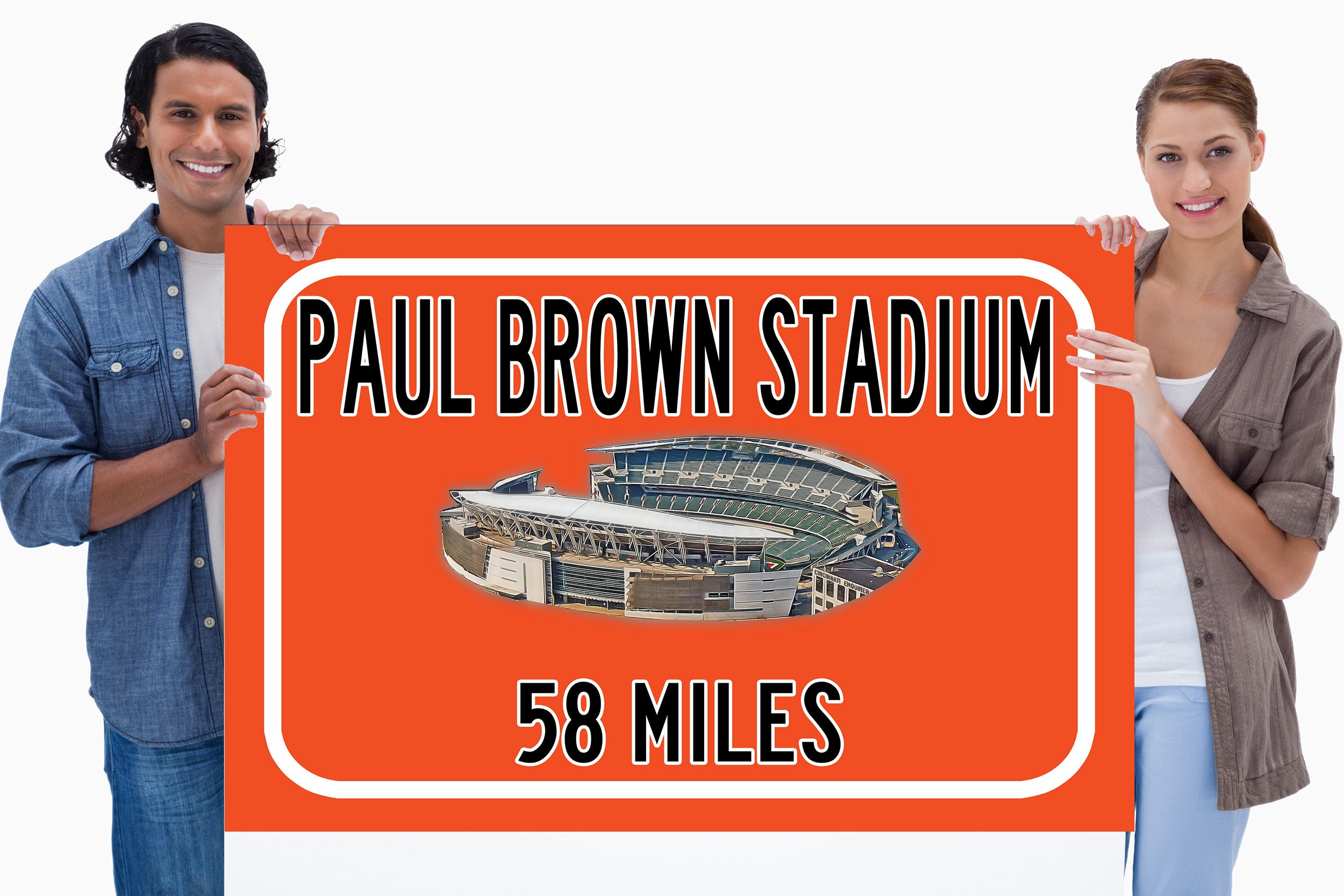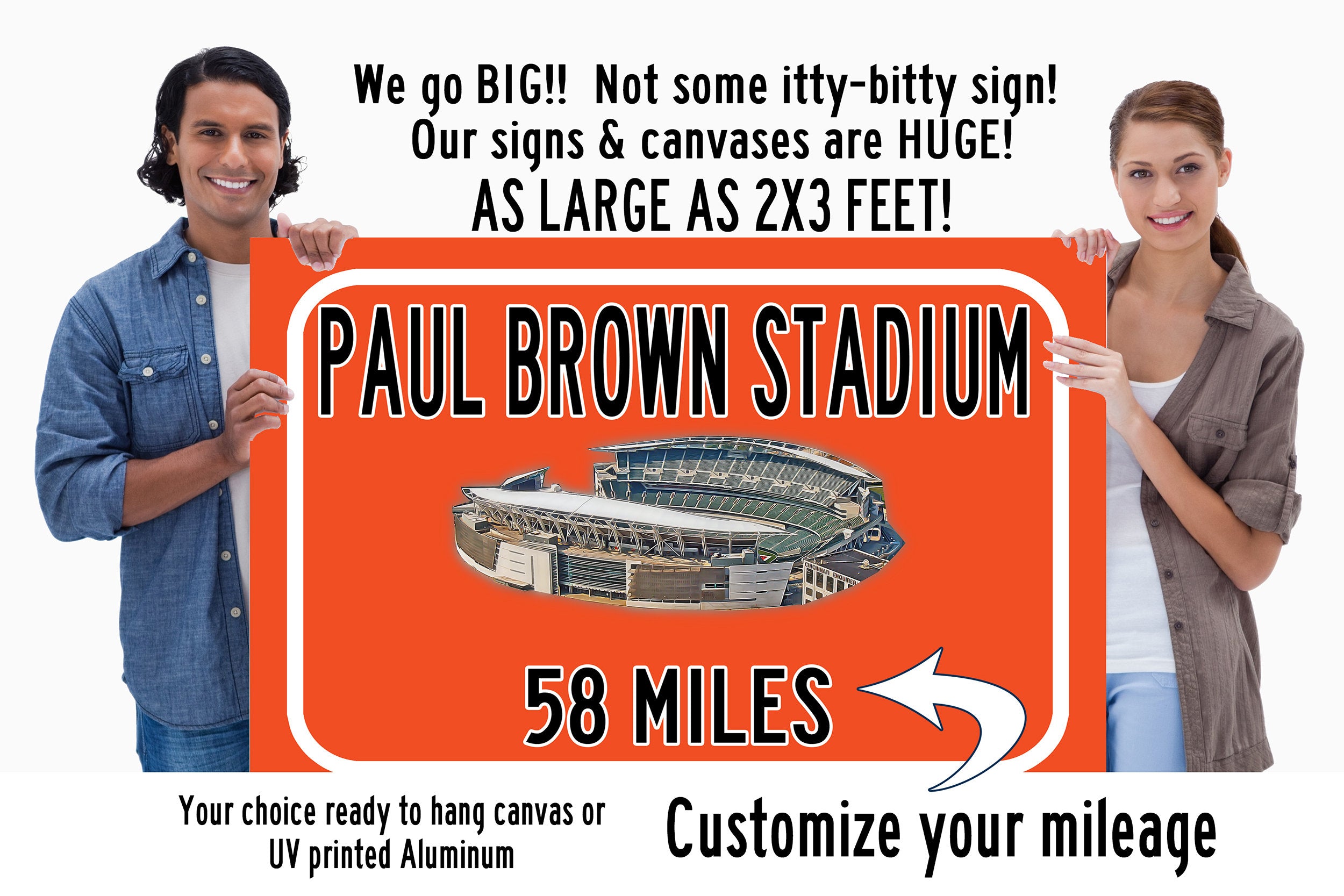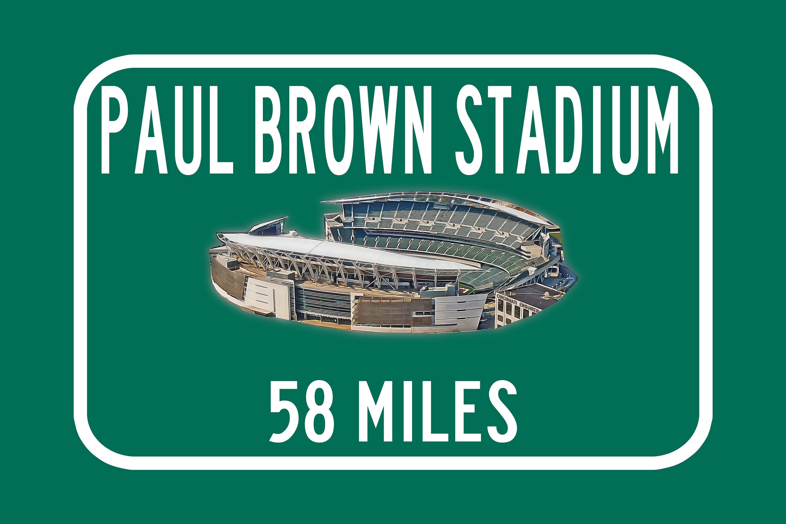 Personalized Highway Distance sign to Paul Brown Stadium in Cincinnati. Custom replica road sign, with a watercolor photo of the stadium made with real distance from you to US Bank Stadium. WE GO HUGE!! Not some itty-bitty sign, Our signs are as large as 2 x 3 FEET! Paul Brown Stadium highway sign. Cincinnati Bengals sign