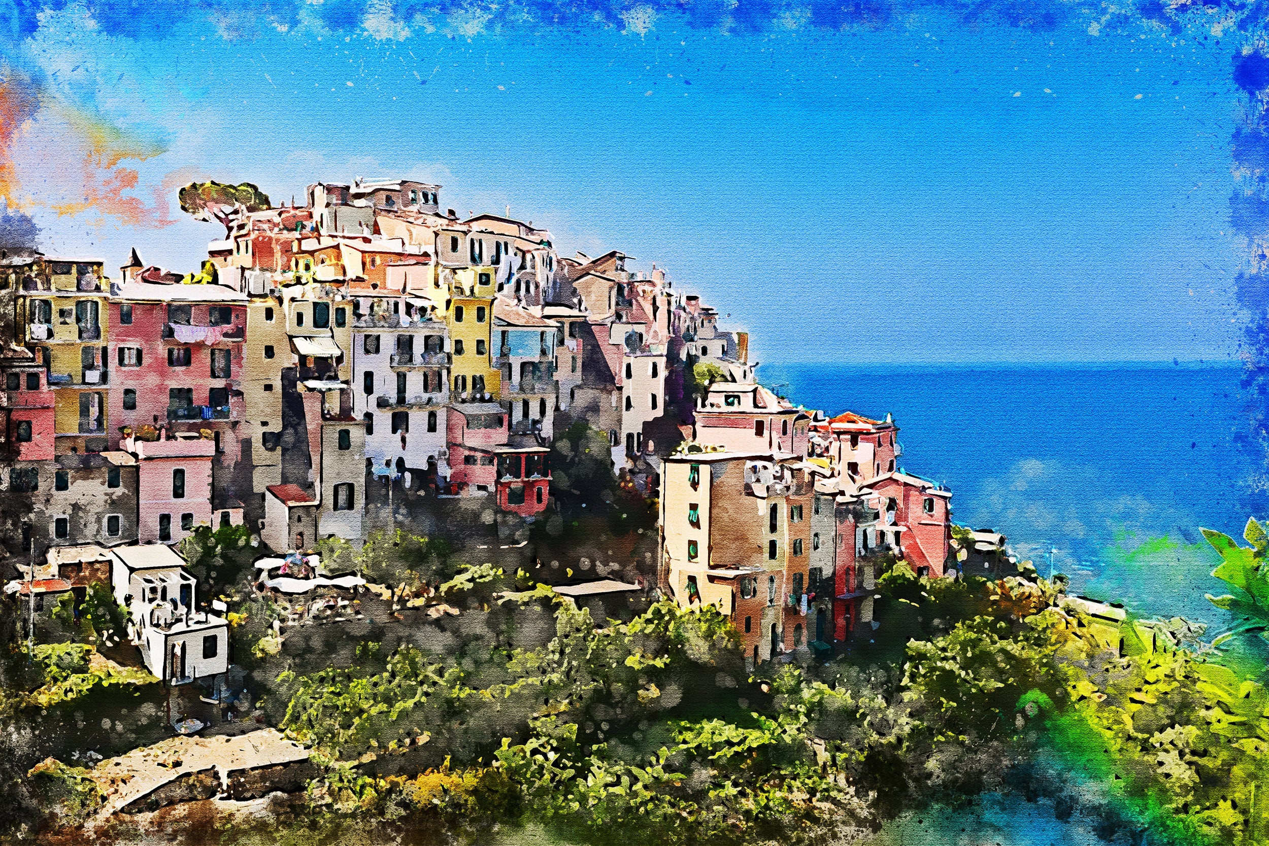 Stunning Photo of Cinque Terre in Italy Great for a piece of wall art. Great for a piece of wall art. Available as a single canvas at 16″ x 24″ , 24″ x 36″ , or 32″ x 48″ or we can make you a special 3 panel work of art as large as 4 x 8 foot wide. Cinque Terre watercolor canvas