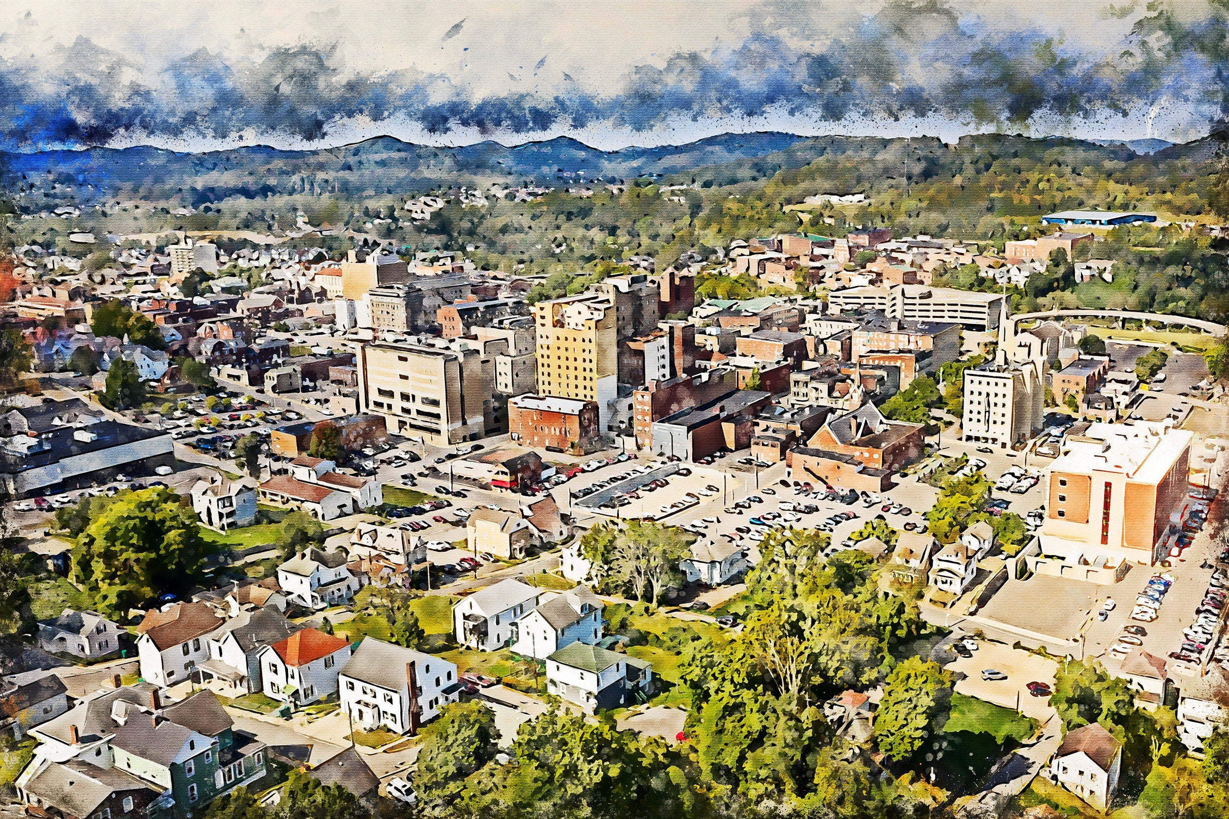 The beautiful city of Clarkburg West Virginia watercolor on canvas framed and ready to hang. Stunning colors that make for the perfect wall decor. Clarkburg WV watercolor canvas