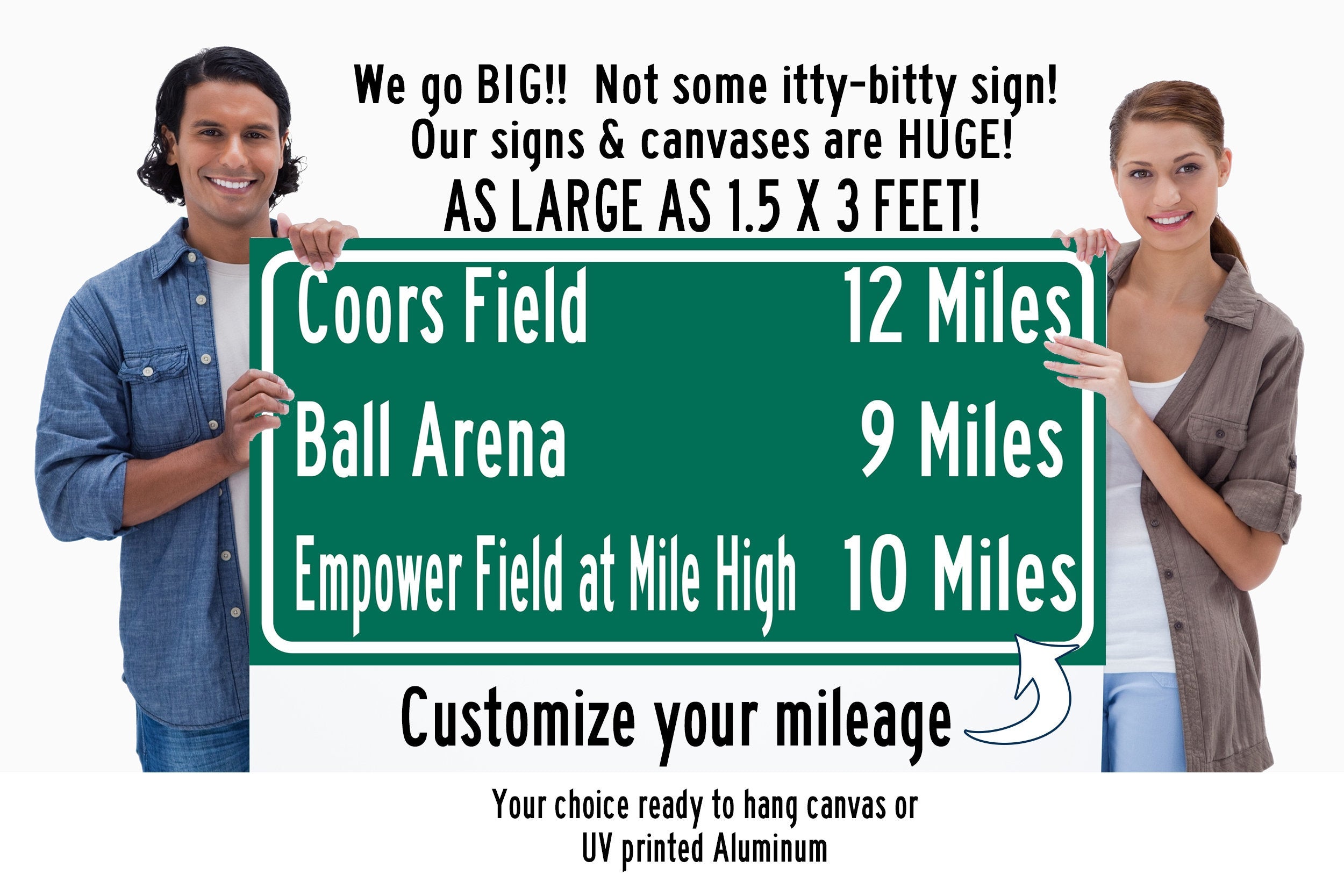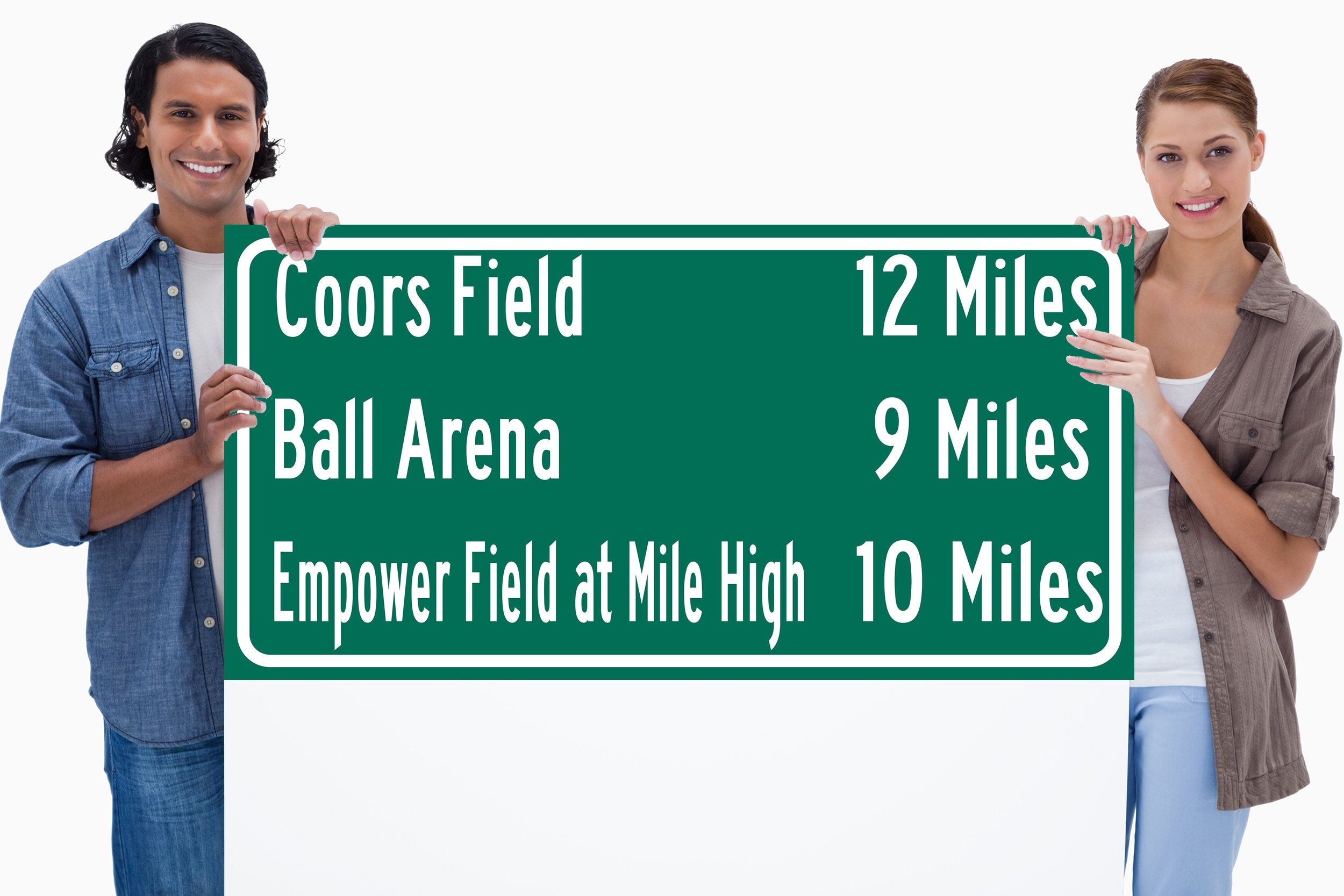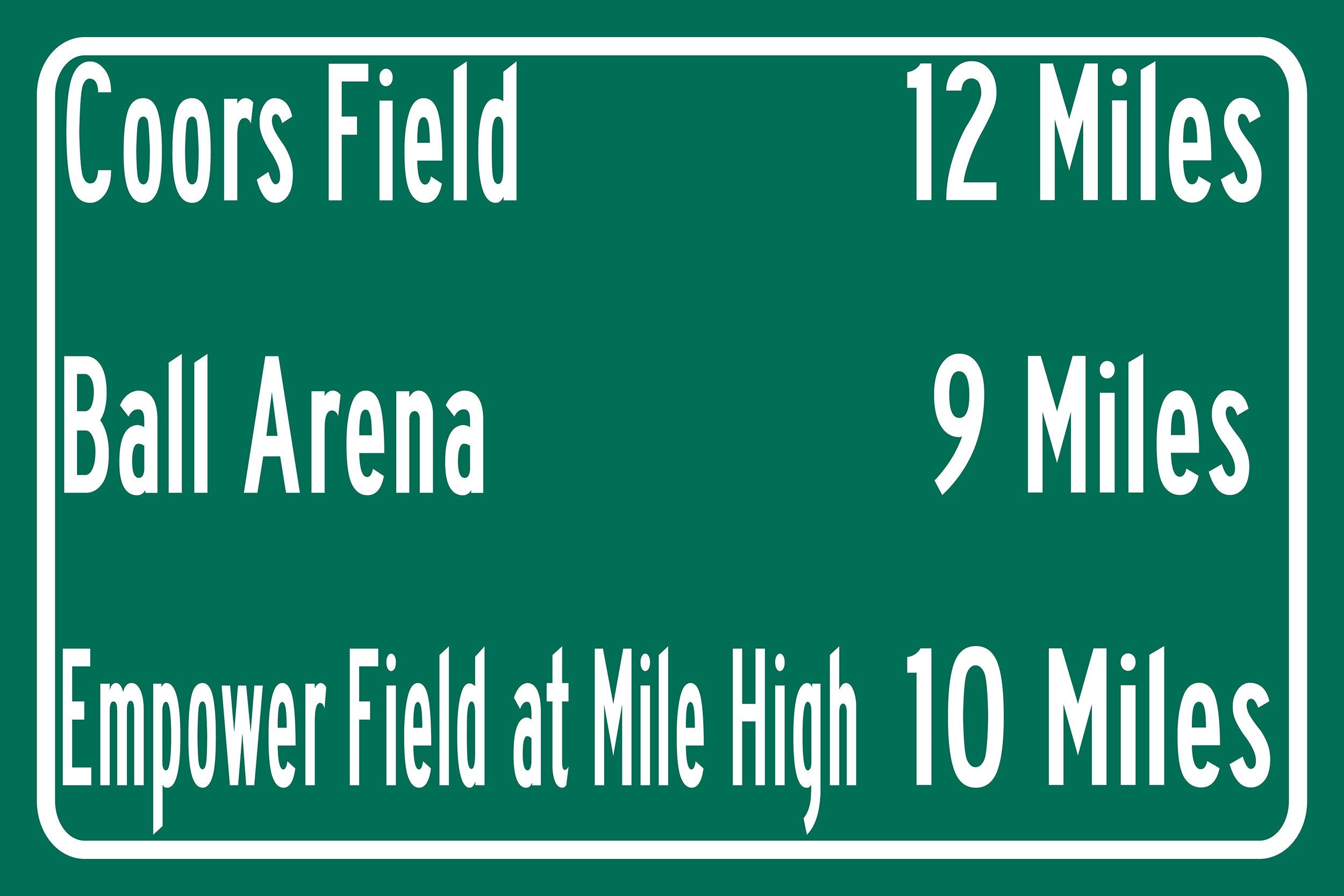Personalized Highway Distance sign to all the Stadiums, Arenas and Ballparks in Denver. Custom replica road sign, of the stadium made with real distance from you to the locations. WE GO HUGE!! Not some itty-bitty sign, Our signs are as large as 2 x 3 FEET! Denver Sports Sign, Empower Field at Mile High, Coors Field, Ball Arena