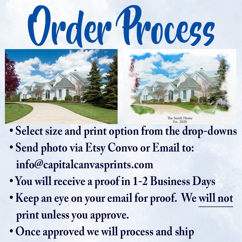 We simply take your original photo and digitally remaster into a custom print. They are digital art and not hand-painted. We will send proofs for approval and will not print without your okay. *So keep an eye on your email for the proof(s). Before sending your image, see our photos for tips from our inhouse photographer.