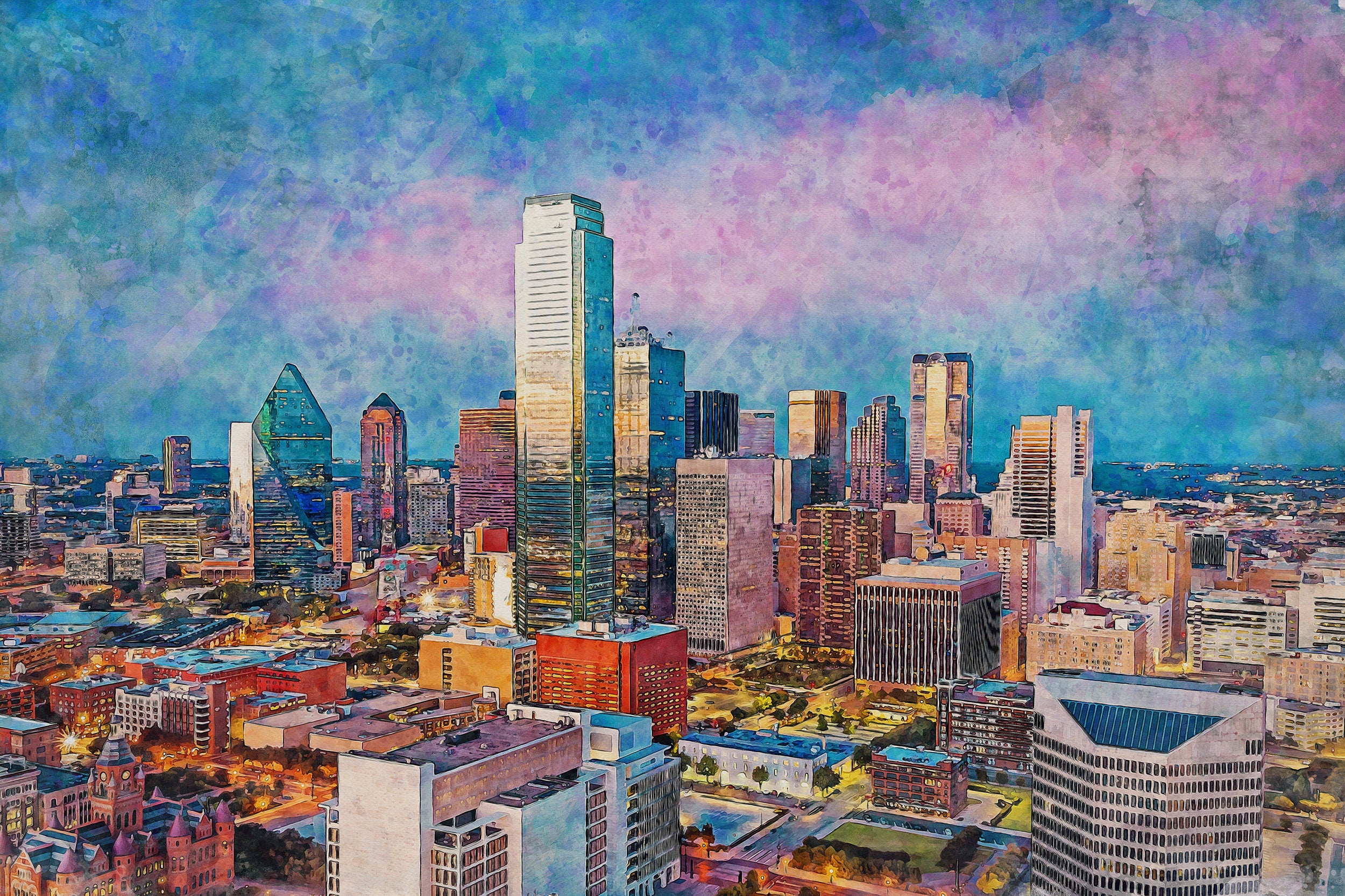 The skyline of Dallas watercolor at dusk. Dallas TX watercolor. Great colors and plenty of lights. Great for a piece of wall art. Available as a single canvas at 16″ x 24″ , 24″ x 36″ , or 32″ x 48″ or we can make you a special 3 panel work of art or get the digital file and you can print it yourself. ( Digital File only, no product included) Dallas art