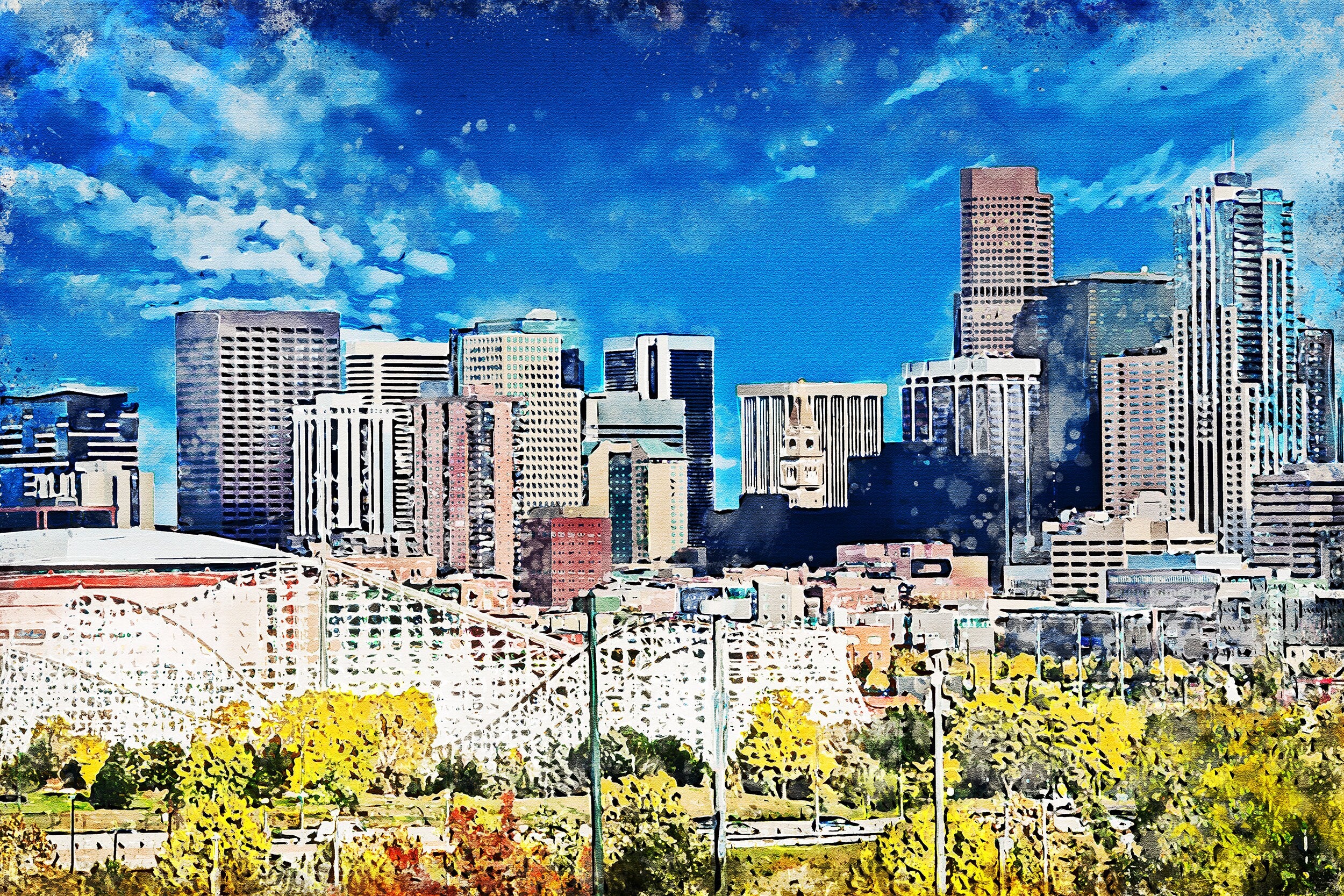Stunning watercolor on canvas of the Denver Colorado skyline. Great for a piece of wall art. Available as a single canvas at 16″ x 24″ , 24″ x 36″ , or 32″ x 48″ or we can make you a special 3 panel work of art. Denver watercolor