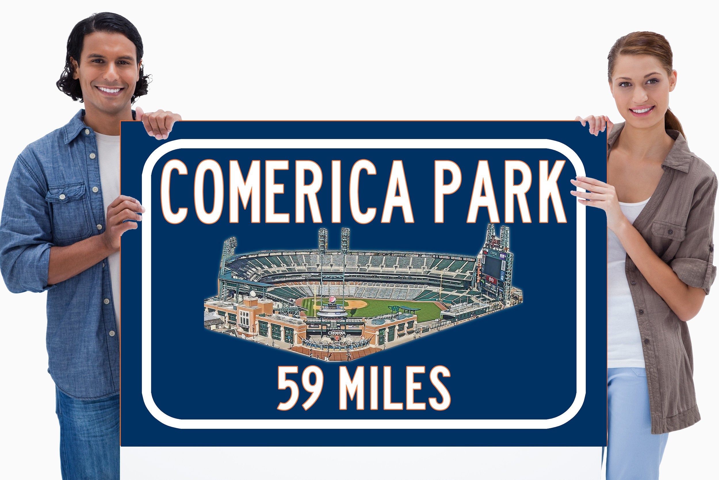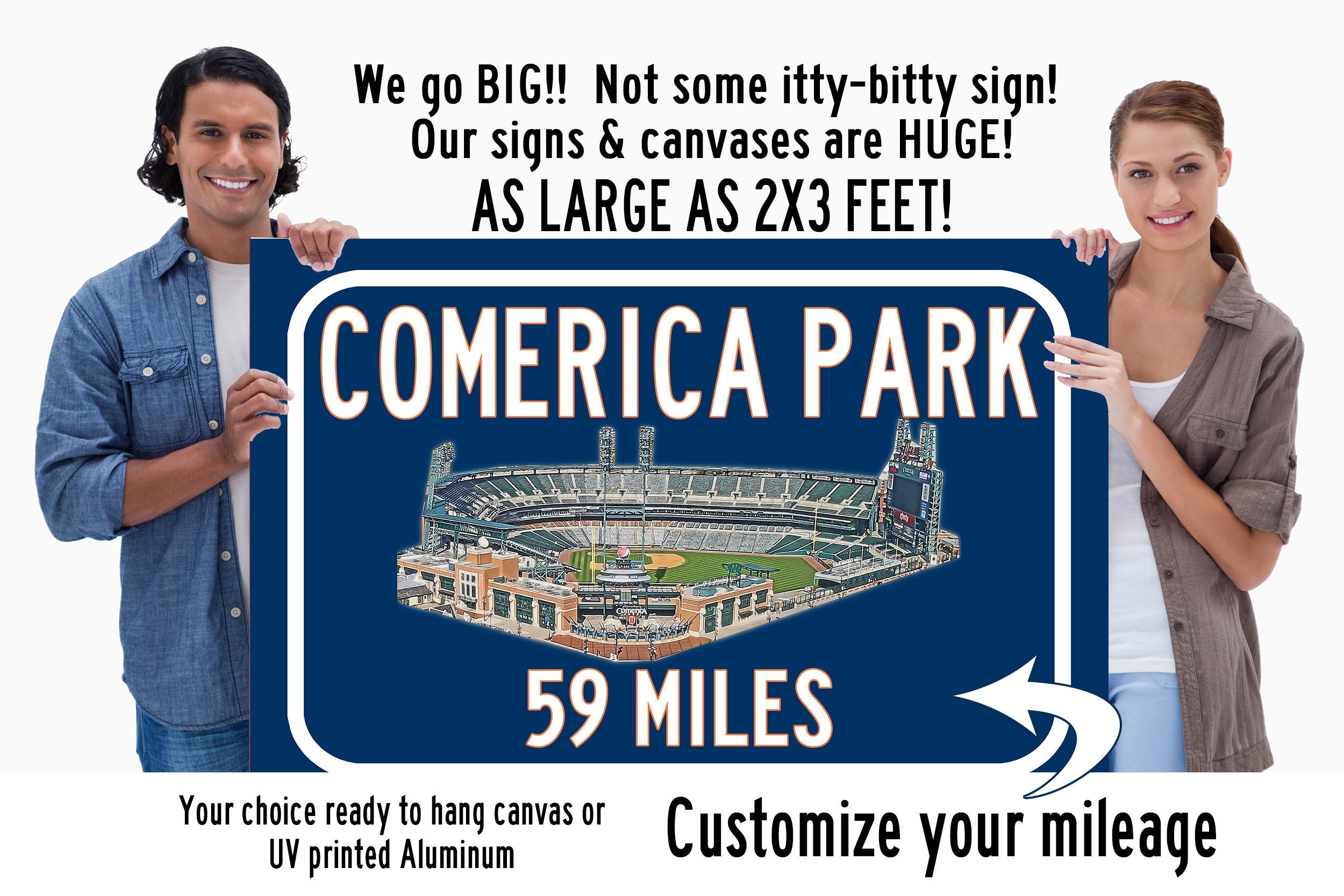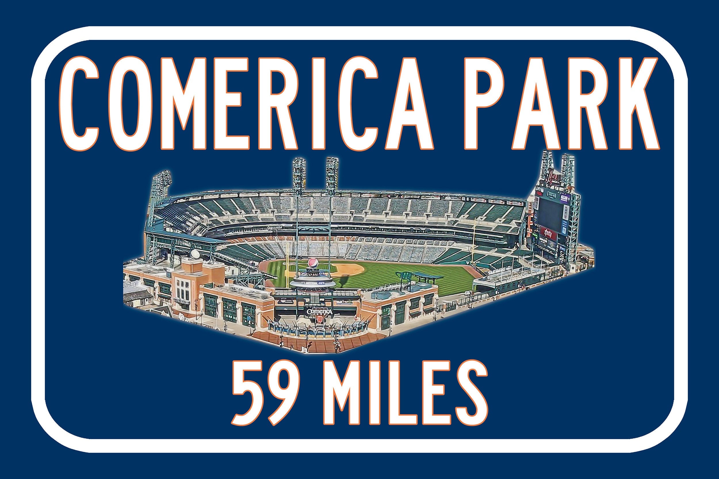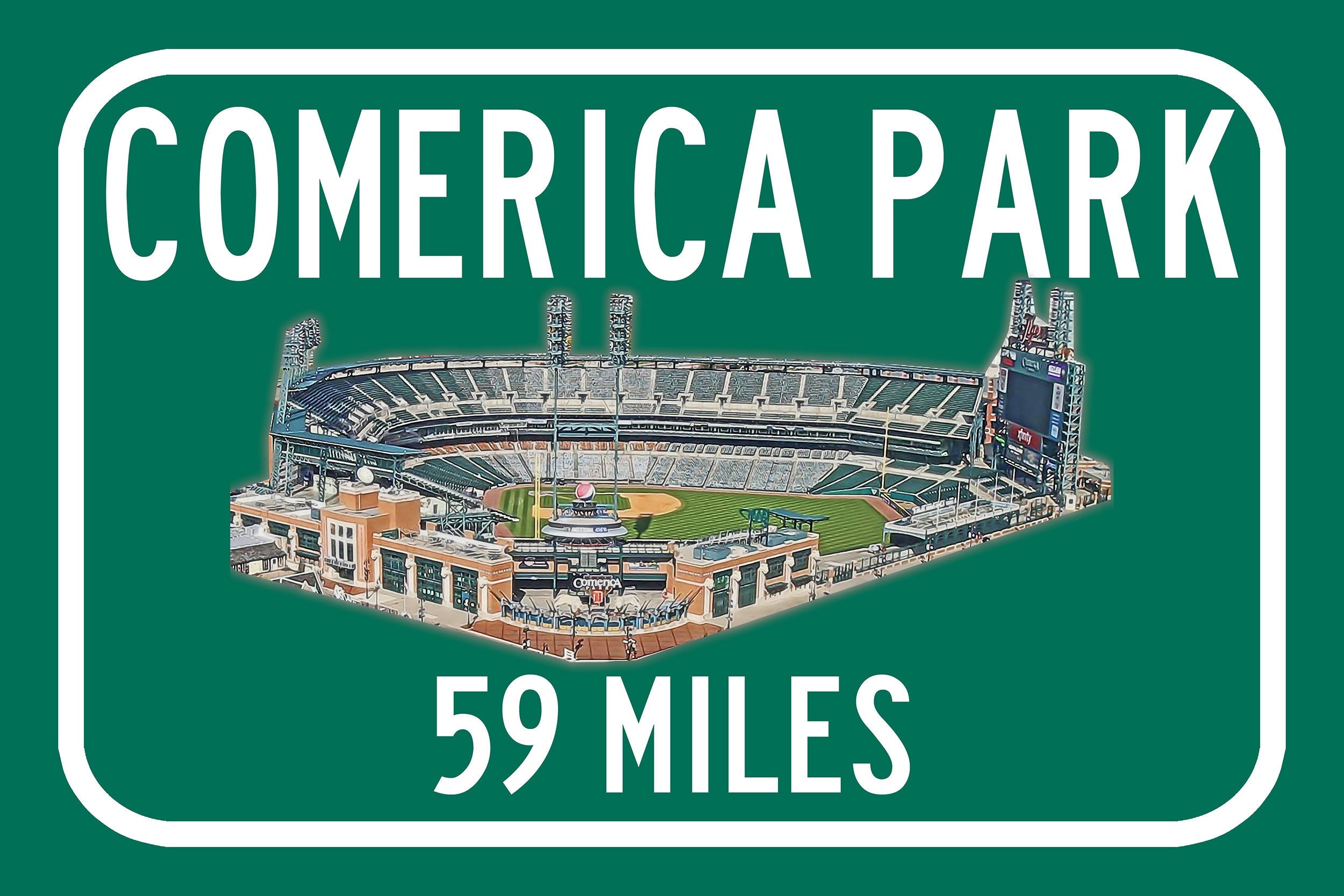 Personalized Highway Distance sign to Comerica Park in Detroit. Custom replica road sign, with a watercolor photo of the stadium made with real distance from you to Comerica Park. WE GO HUGE!! Not some itty-bitty sign, Our signs are as large as 2 x 3 FEET! Comerica Park highway sign. Detroit Tigers Sign