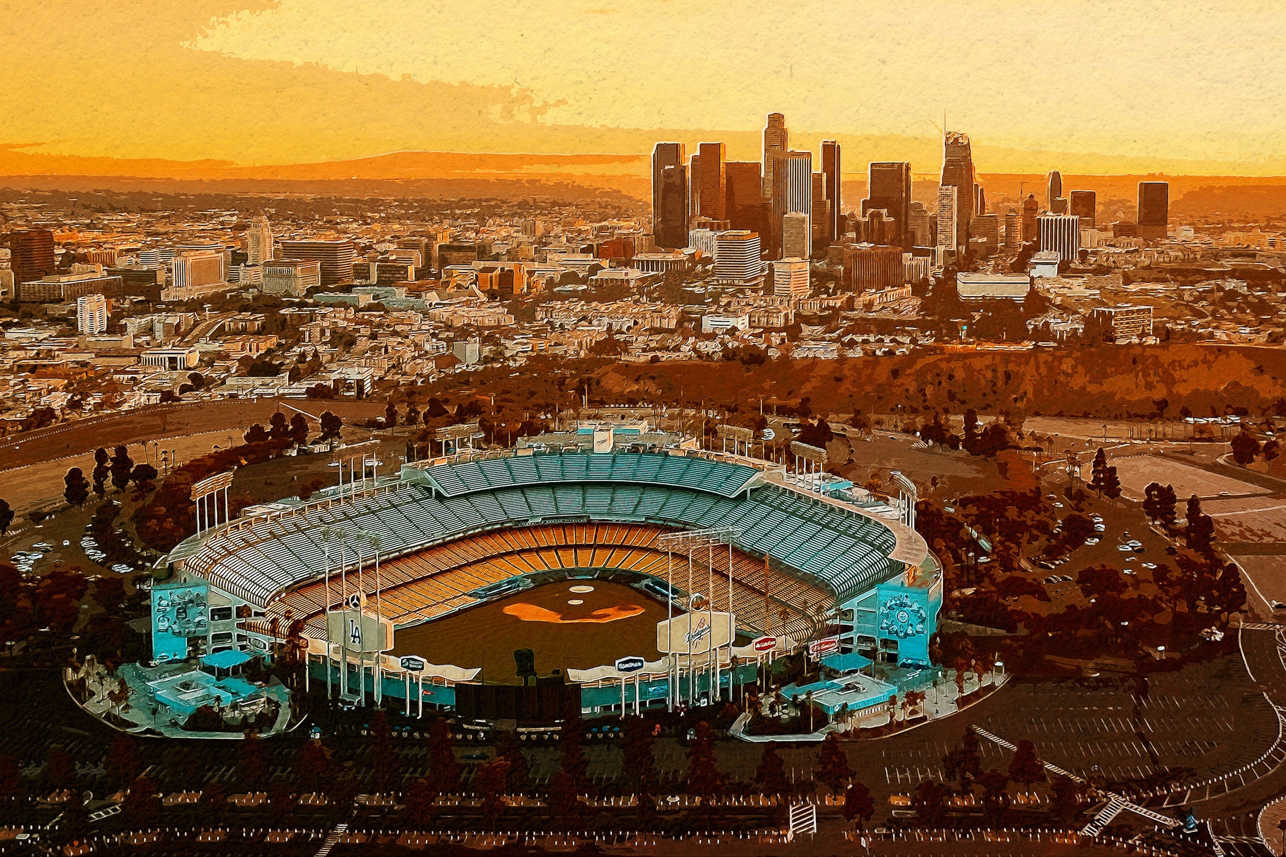 Dodger Stadium Watercolor and the Skyline of Los Angeles. Available as a SINGLE canvas at 12″ x 18″, 16″ x 24″ , 24″ x 36″ or if you prefer, a digital download and you can print it your self. (no physical product sent)
