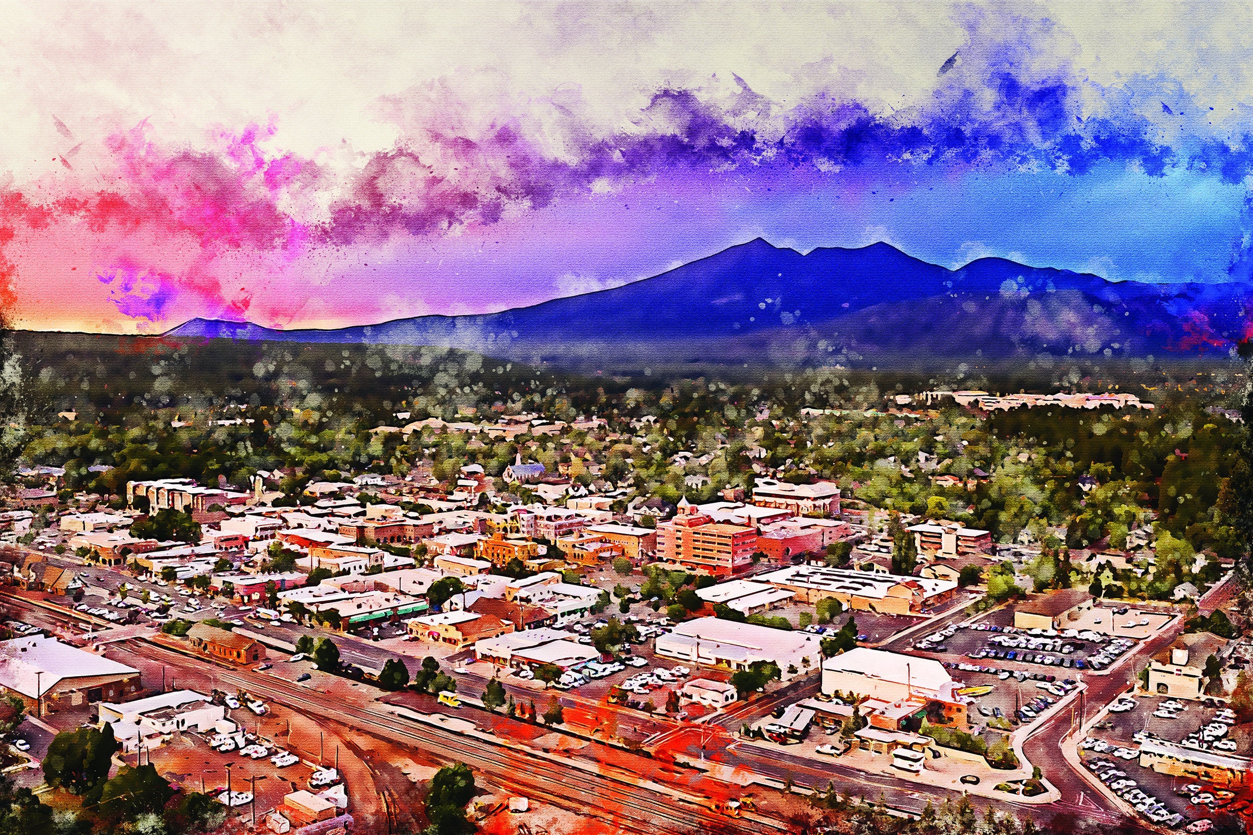 The beautiful watercolor of Flagstaff on canvas framed and ready to hang. Stunning colors that make for the perfect wall decor. Flagstaff watercolor canvas skyline
