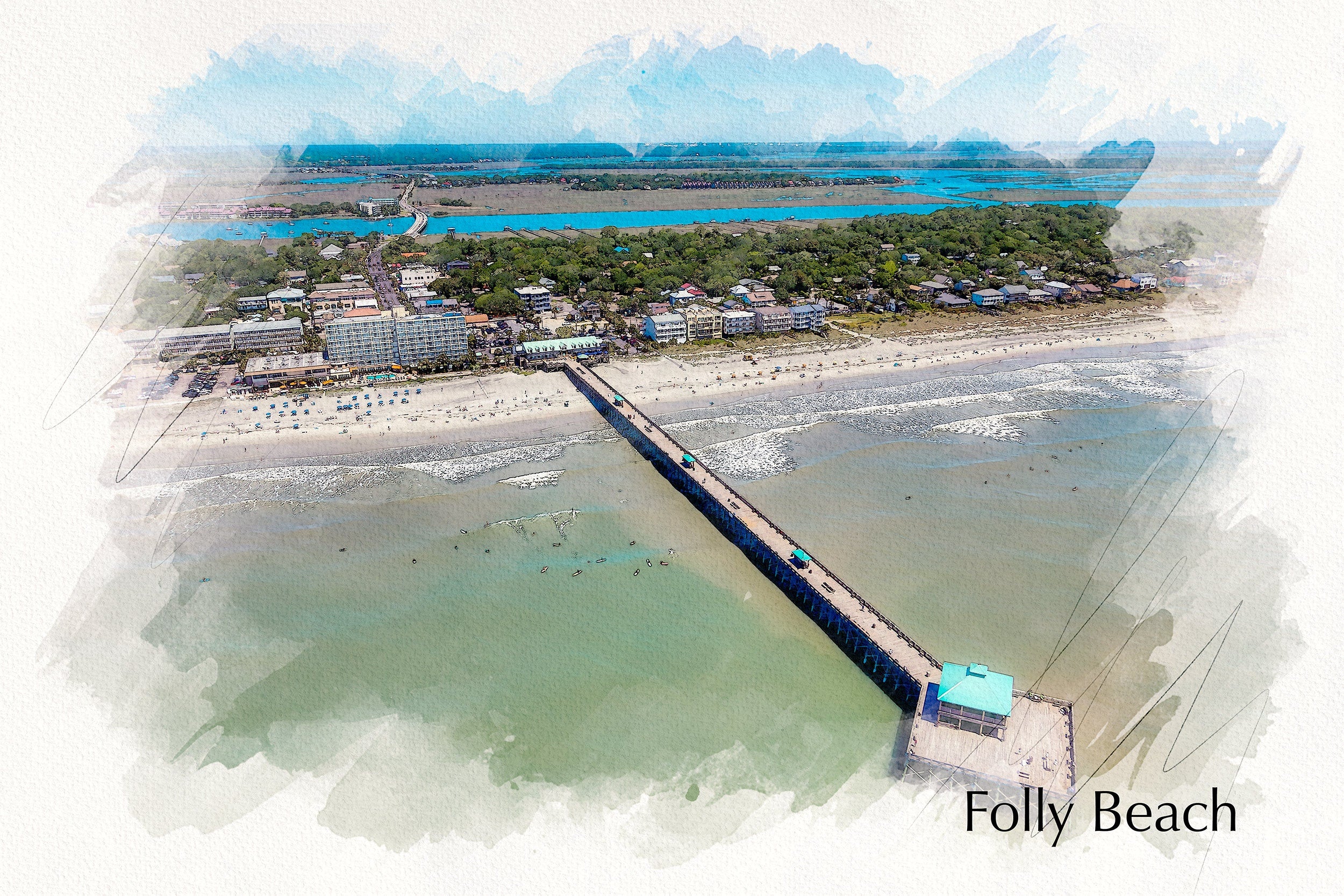 Stunning Photo of Folly Beach from the air. Great for a piece of wall art. Available as a single canvas at 16″ x 24″ , 24″ x 36″ , or 32″ x 48″ or we can make you a special 3 panel work of art. Folly Beach water olor