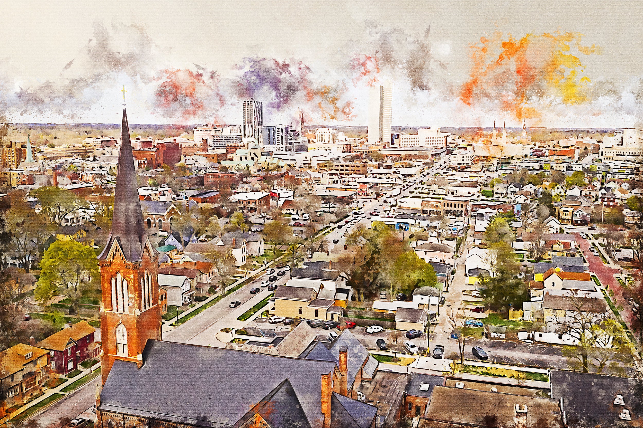 Stunning watercolor of the Fort Wayne Indiana skyline. Fort Wayne watercolor on canvas Great for a piece of wall art. Available as a single canvas at 16″ x 24″ , 24″ x 36″ , or 32″ x 48″ or we can make you a special 3 panel work of art as large as 4 x 8 foot wide.