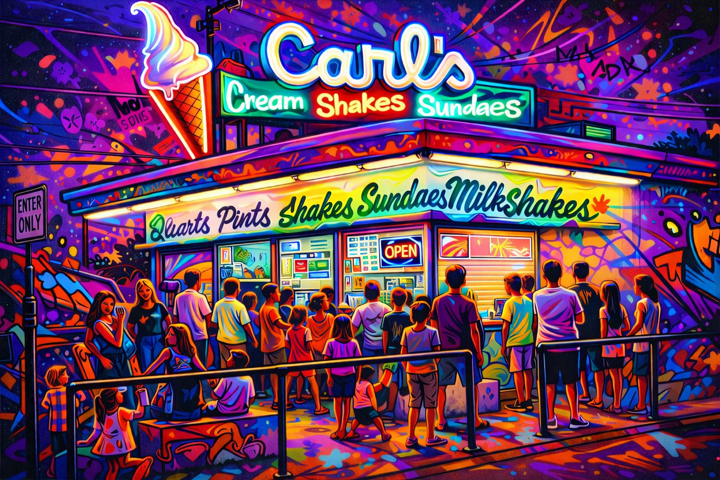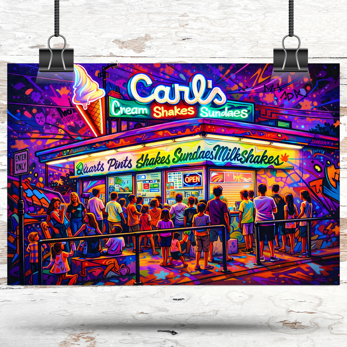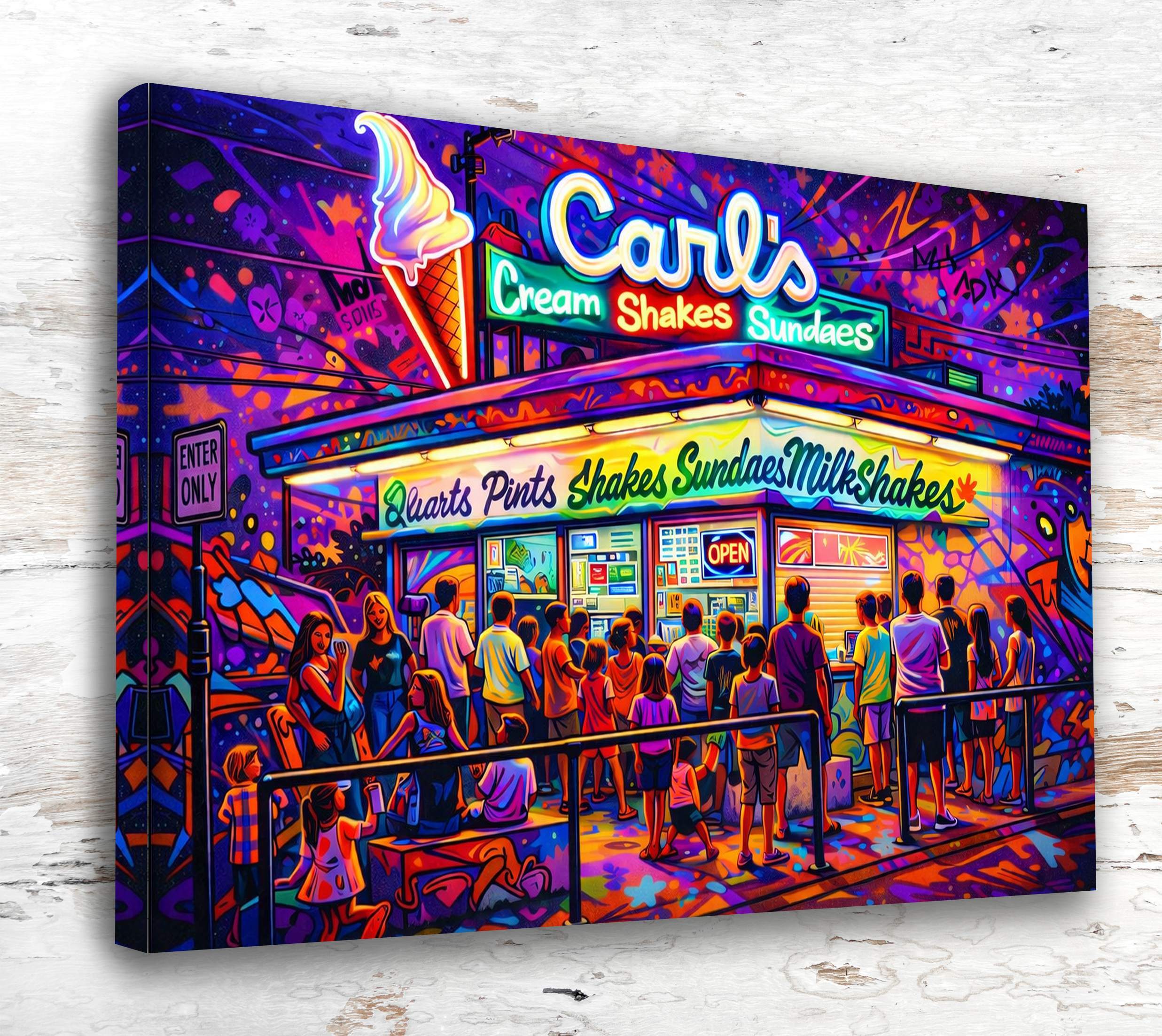 Bring the energy of a summer night to your space with this vibrant Carl’s ice cream shop artwork inspired by classic neon signs and late-night dessert runs. The glowing colors, lively crowd, and retro diner feel make this piece a true statement for kitchens, game rooms, offices, or anywhere that needs a pop of fun.