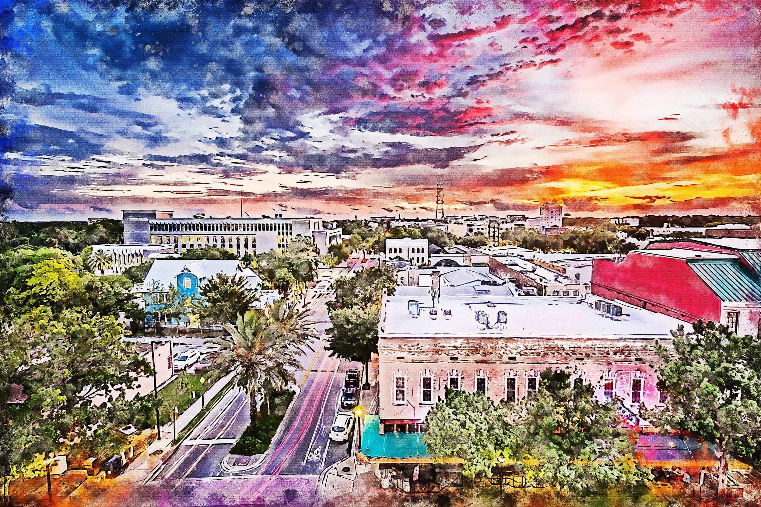 Stunning watercolor of the skyline of Gainesville Florida. Great for a piece of wall art. Available as a single canvas at 16″ x 24″ , 24″ x 36″ , or 32″ x 48″ or we can make you a special 3 panel work of art as large as 4 x 8 foot wide.