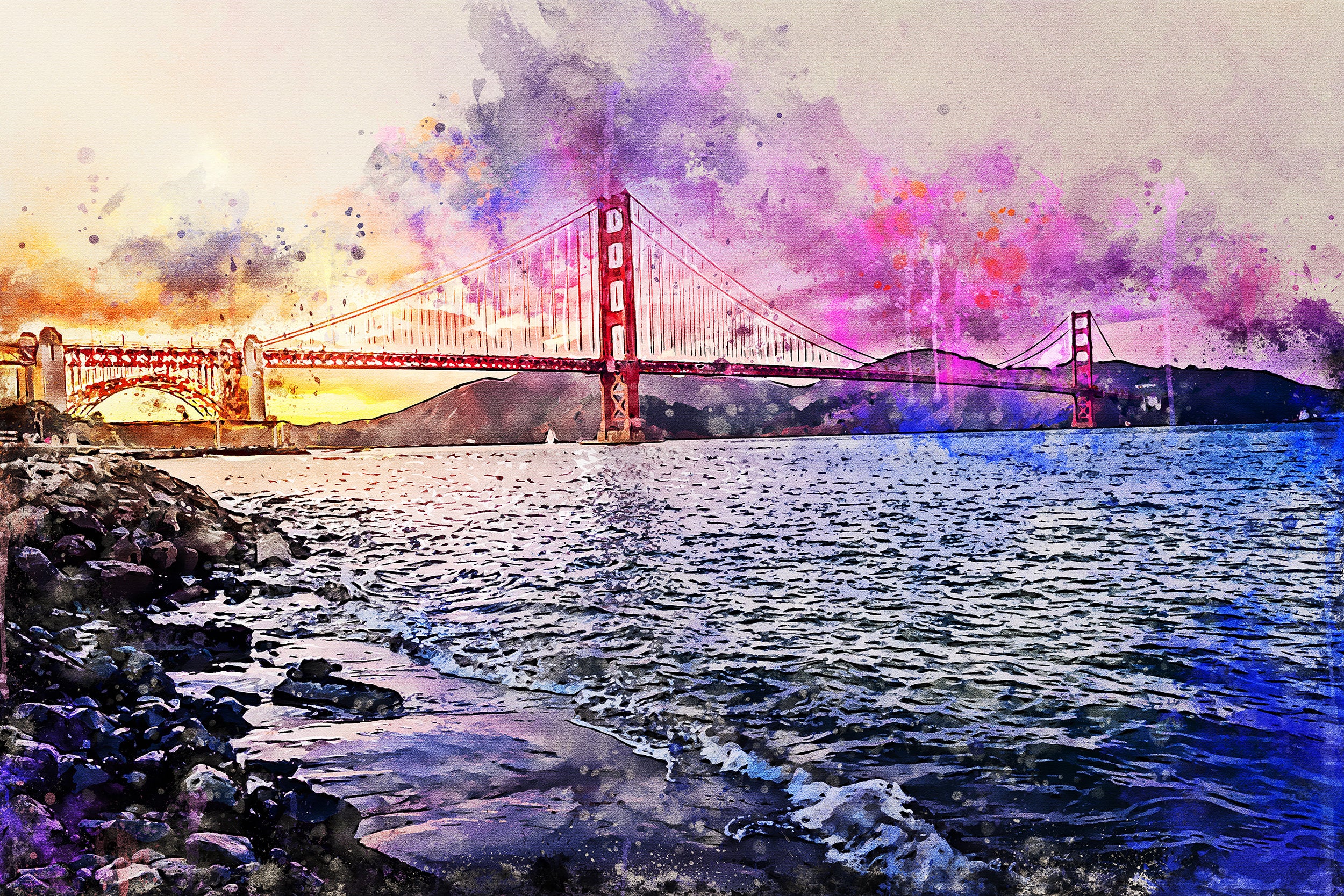 Stunning watercolor of the Golden Gate Bridge in San Francisco. Golden Gate Bridge watercolorAvailable as a single canvas at 16″ x 24″ , 24″ x 36″ , or 32″ x 48″ or we can make you a special 3 panel work of art as large as 4 x 8 foot wide or purchase our digital download to print yourself (no product will be sent)