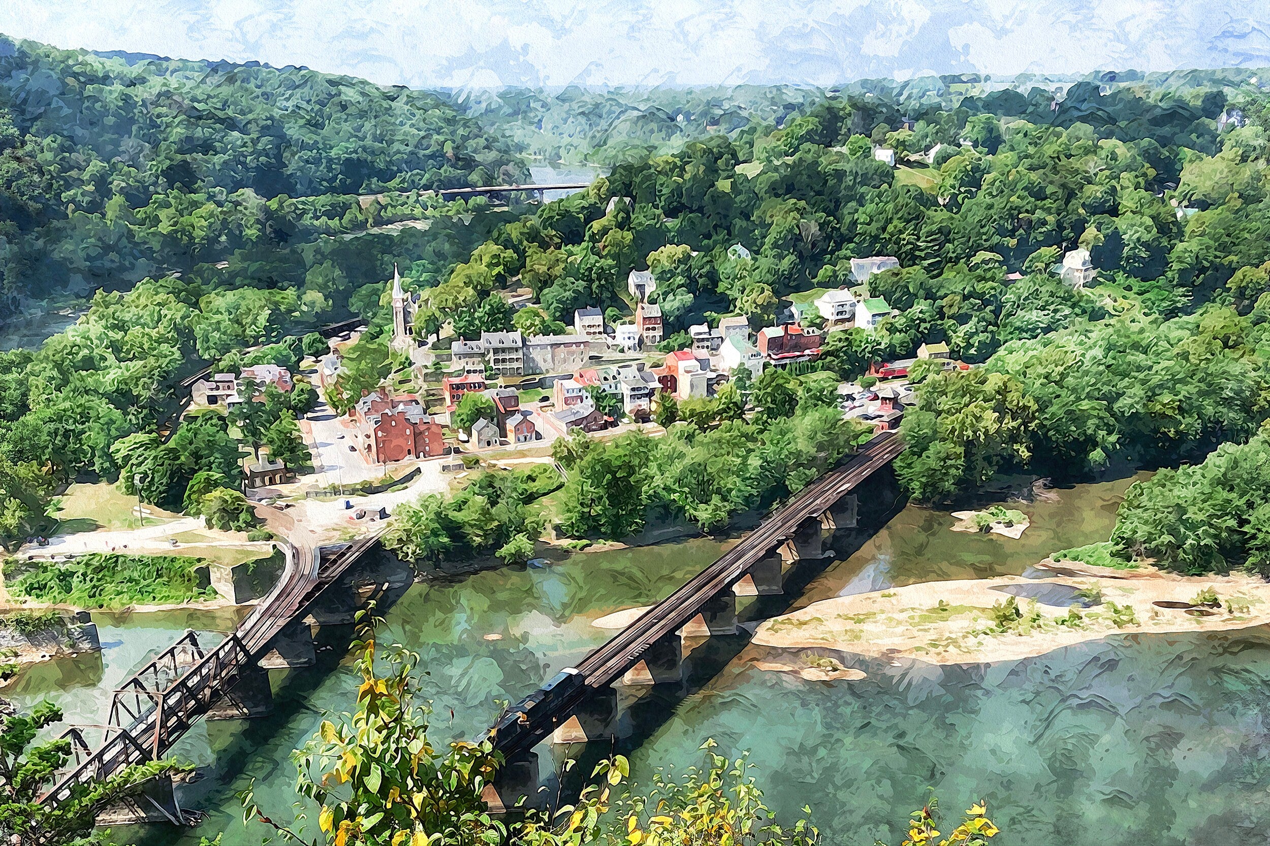 The beautiful town of Harpers Ferry WV on canvas framed and ready to hang. Stunning colors that make for the perfect wall decor. Harpers Ferry watercolor canvas