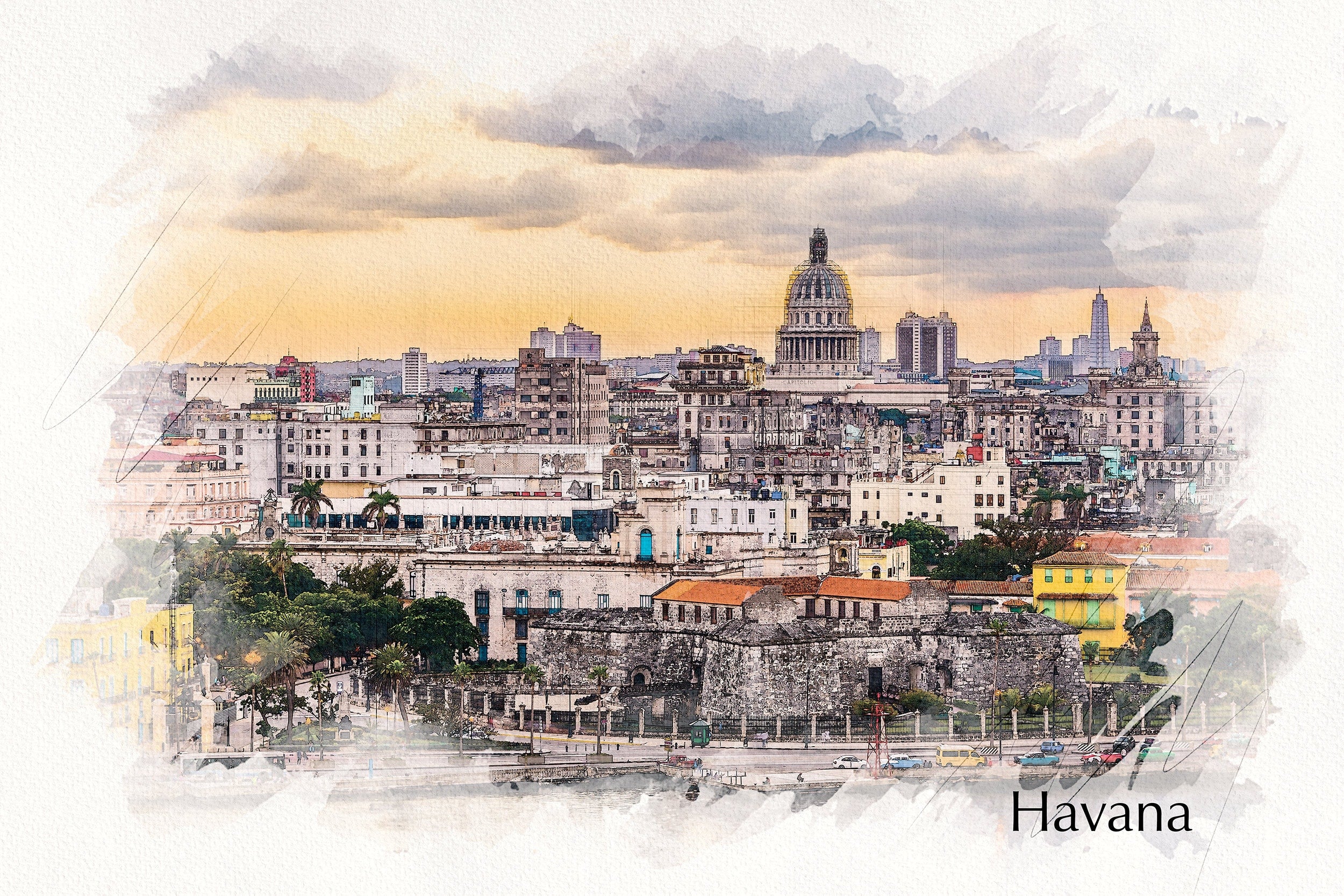 Stunning watercolor of Havana Cuba. Would look great in your game room or basement, Great for a piece of wall art. Available as a single canvas at 16″ x 24″ , 24″ x 36″ , or 32″ x 48″ or we can make you a special 3 panel work of art. Havana Cuba watercolor