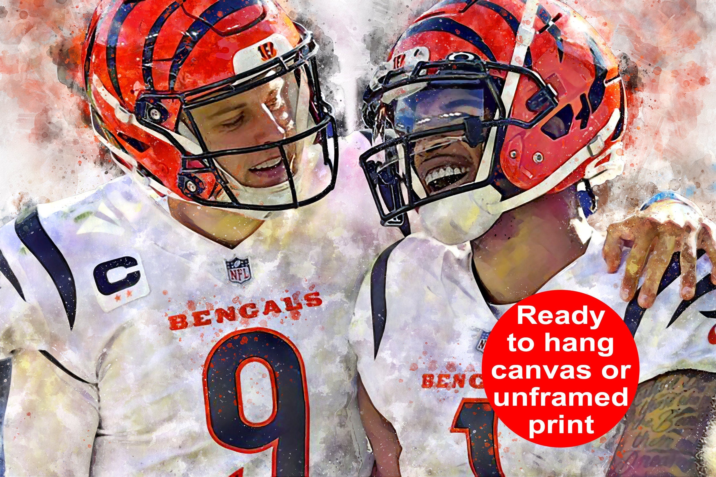 Great for a piece of Joe Burrow and Ja’Marr Chase wall art. Available in several sizes as an unframed print or a ready to hang mounted canvas. Joe Burrow. Ja’Marr Chase poster