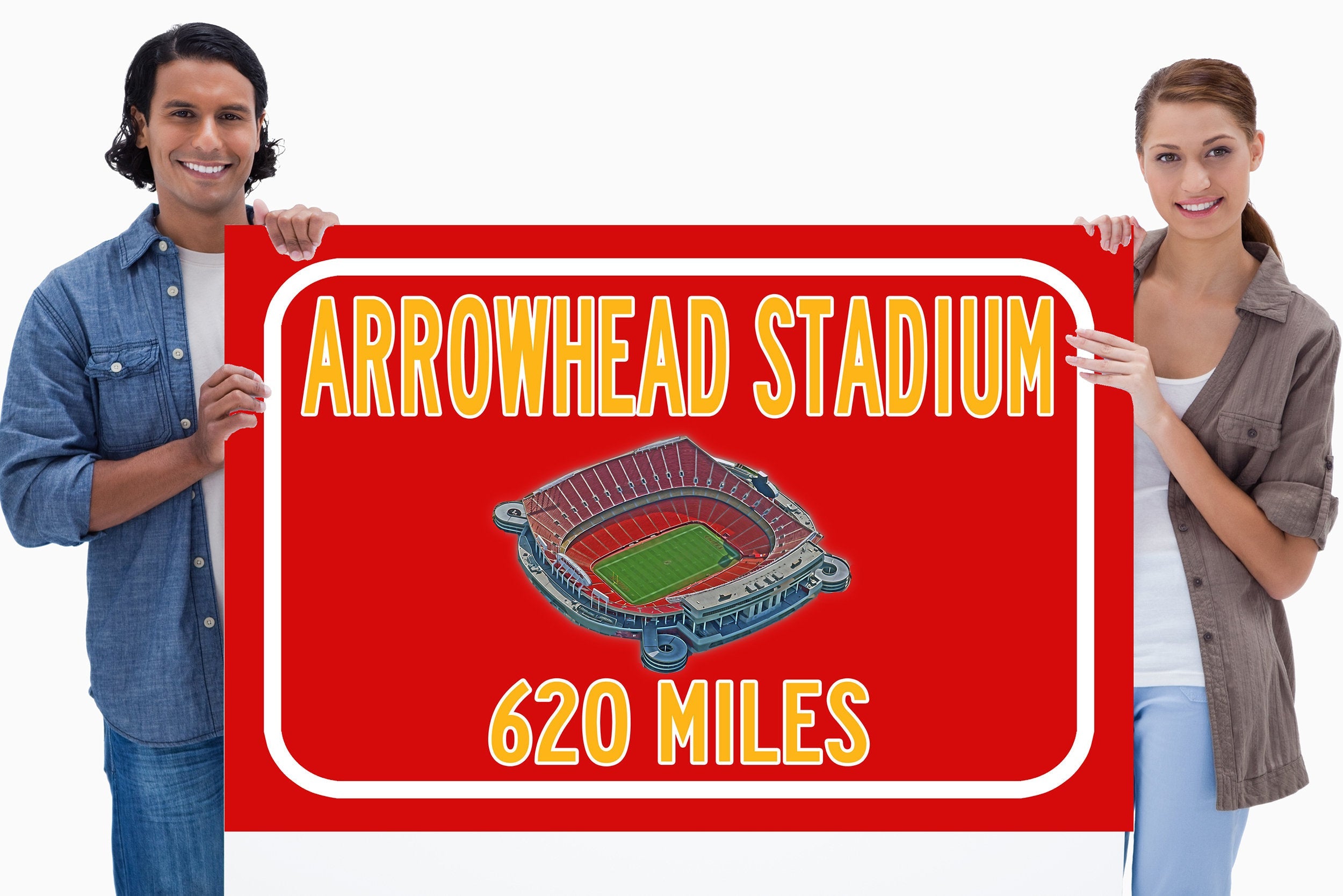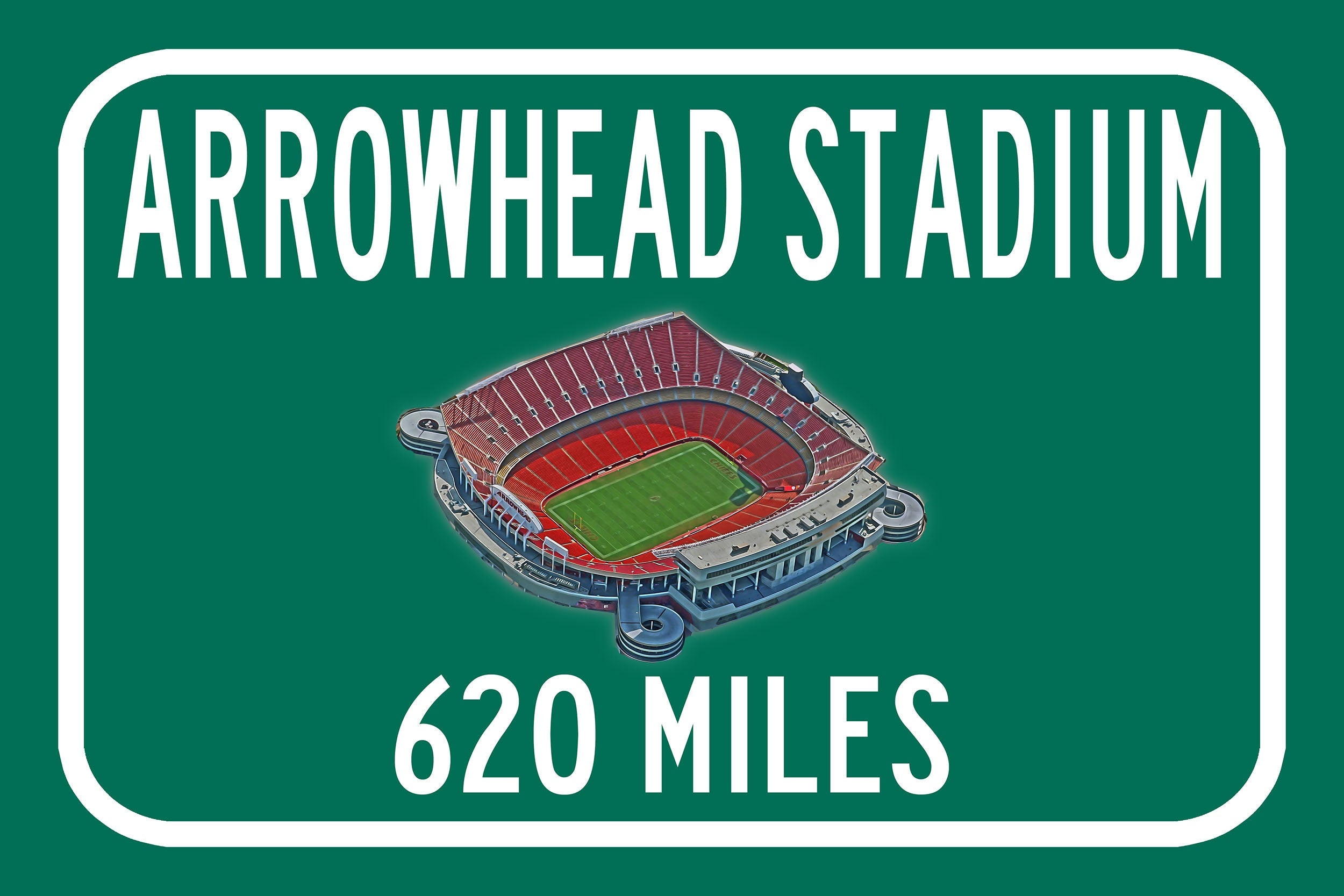 Personalized Highway Distance sign to Arowhead Stadium Stadium in Kansas City. Custom replica road sign, with a watercolor photo of the stadium made with real distance from you to Arrowhead Stadium. WE GO HUGE!! Not some itty-bitty sign, Our signs are as large as 2 x 3 FEET! Arrowhead Stadium highway sign. Kansas City Chiefs sign