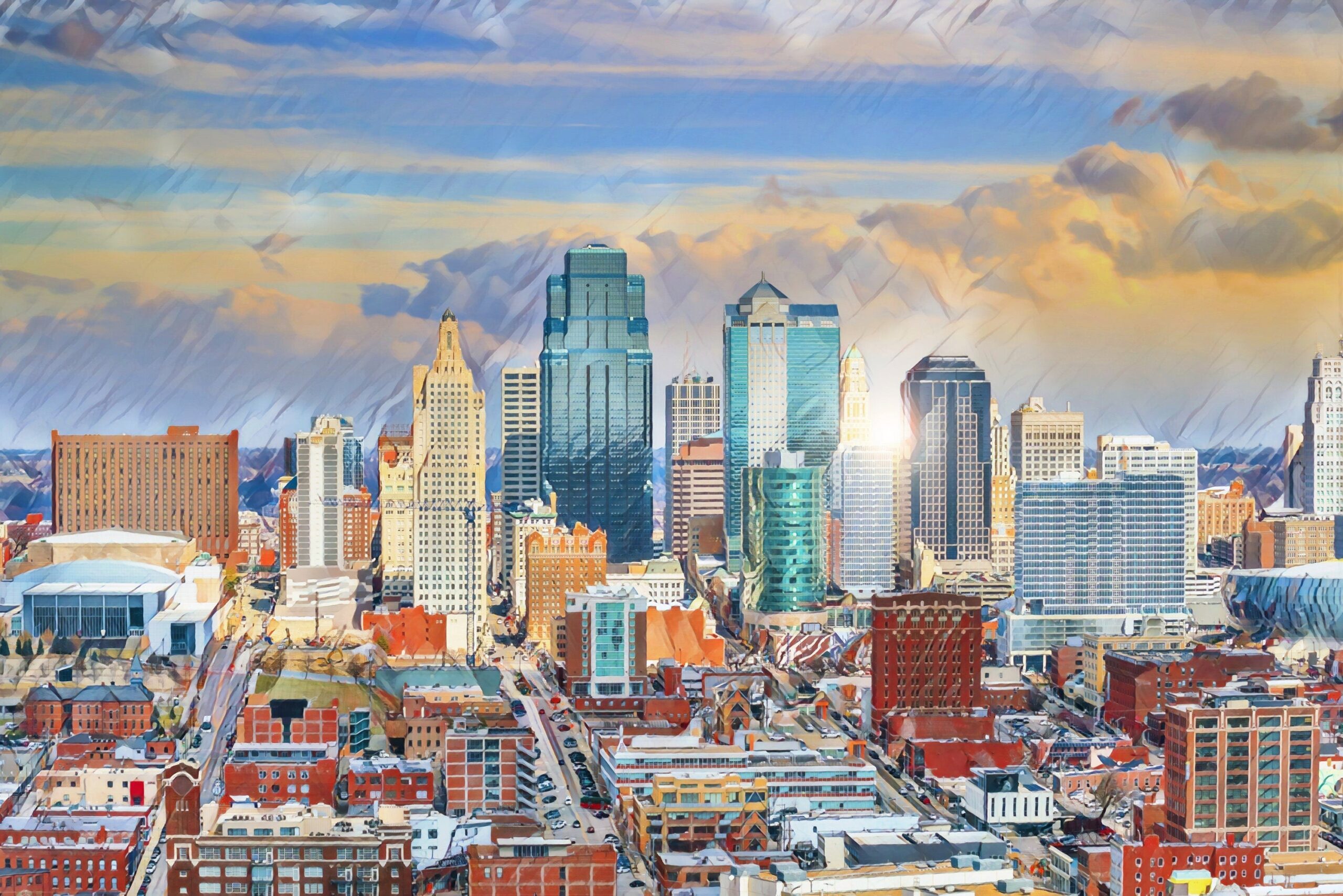 The beautiful watercolor of Kansas City on canvas framed and ready to hang. Stunning colors that make for the perfect wall decor. Kansas City watercolor