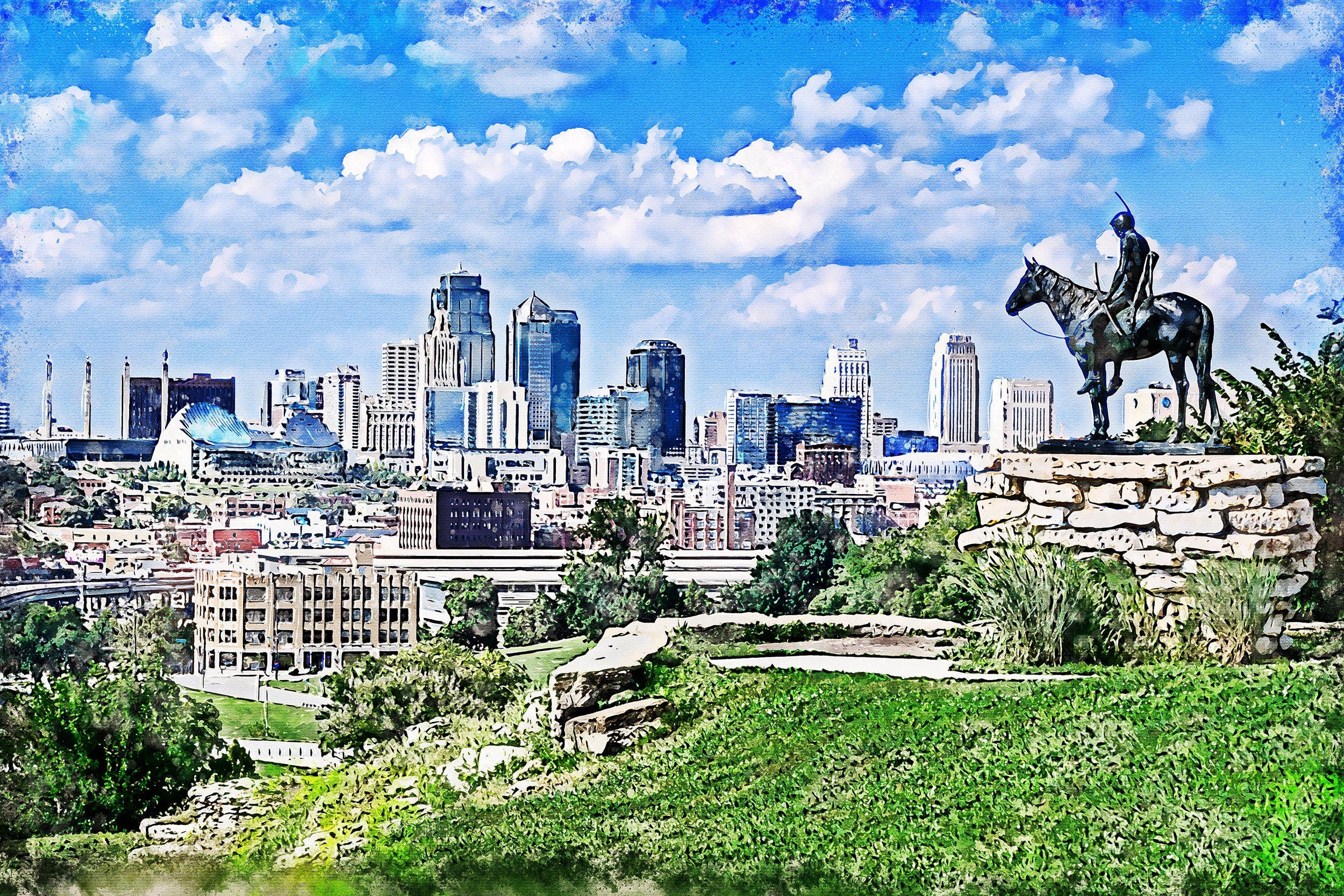 The beautiful watercolor of Kansas City on canvas framed and ready to hang. Stunning colors that make for the perfect wall decor. Kansas City watercolor art