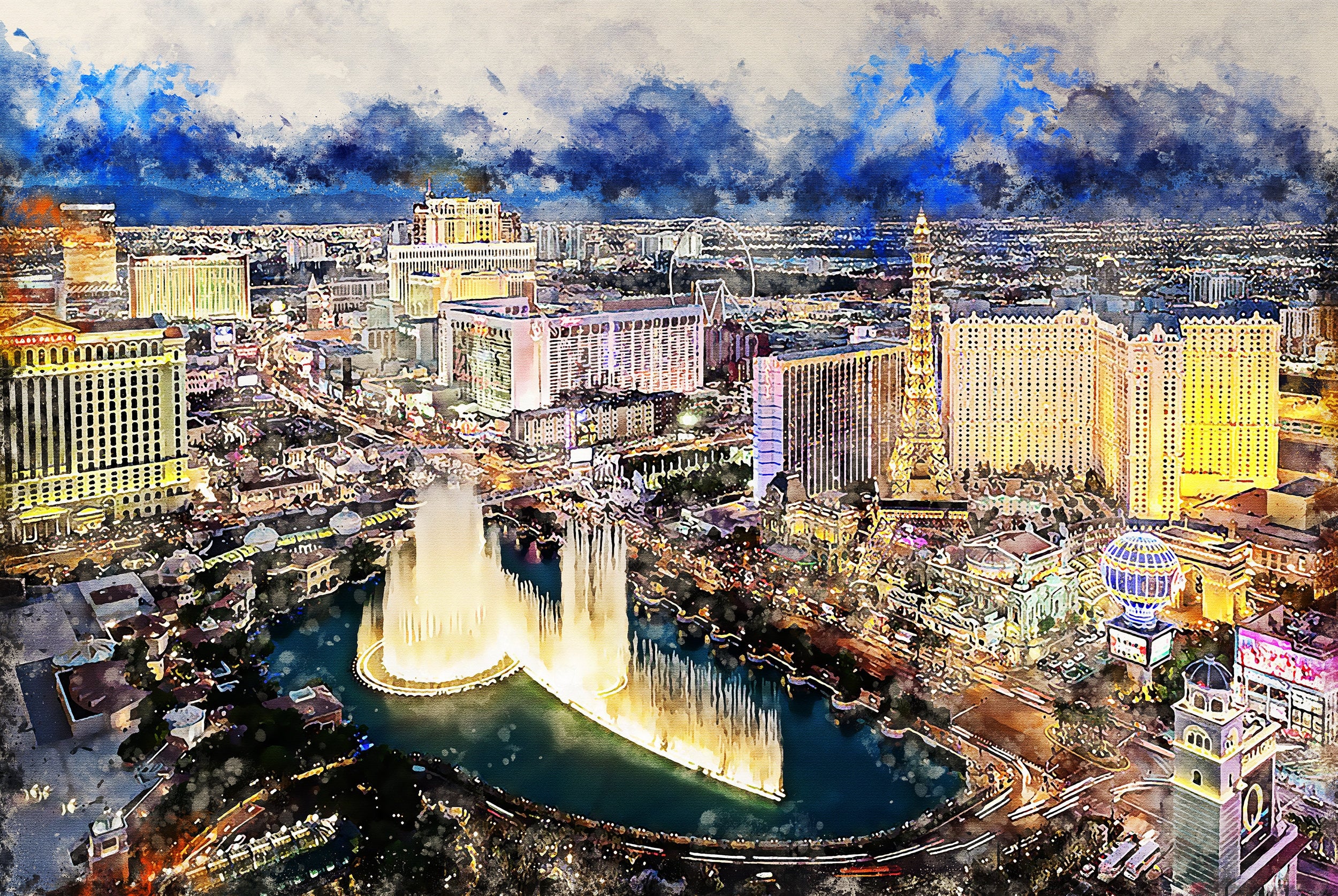 WOW what a great photo of Las Vegas. Las Vegas Watercolor. Would look great in your game room or basement, Available as a single canvas at 16″ x 24″ , 24″ x 36″ , or 32″ x 48″ or we can make you a special 3 panel work of art or if you prefer, a digital download and you can print it your self. (no physical product sent) Las Vegas art