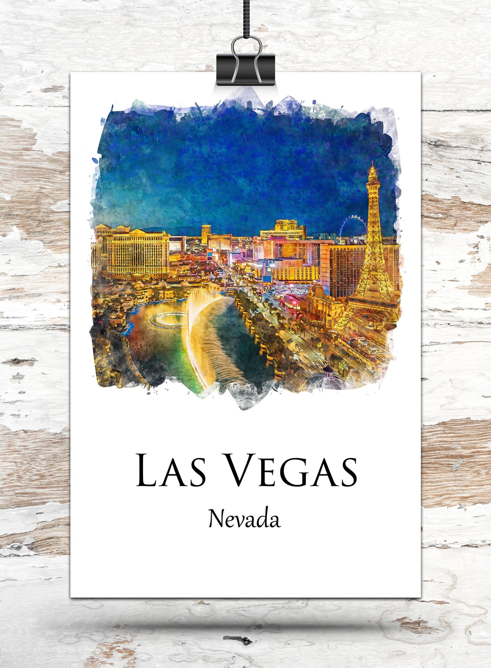 Infuse your living space with the vibrant essence of Las Vegas art print with this stunning Las Vegas watercolor travel art canvas print. The bold, bright colors and whimsical watercolor technique capture the essence of this bustling city’s bright lights and dynamic energy.
