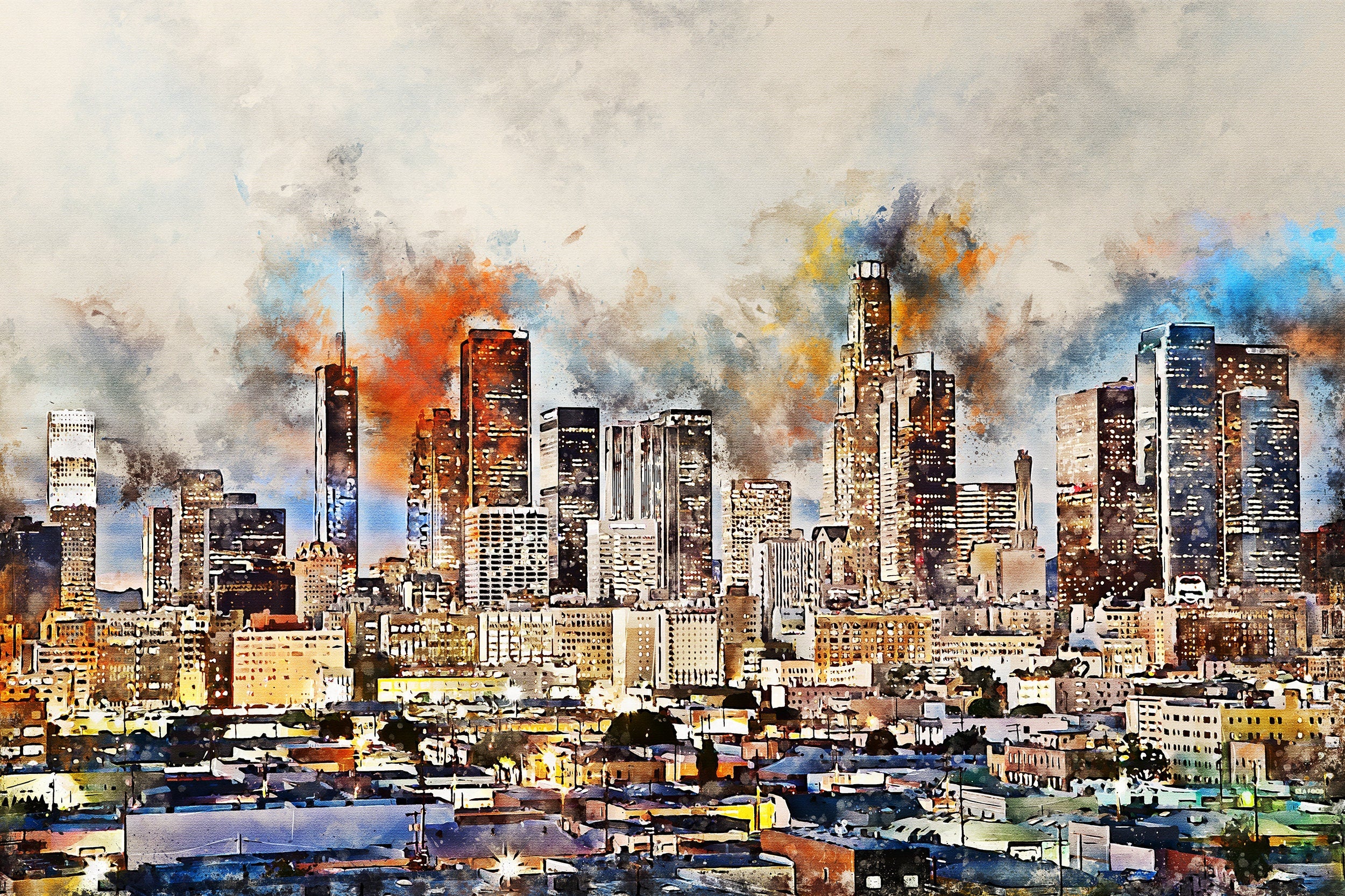 The beautiful watercolor of Los Angeles on canvas framed and ready to hang. Stunning colors that make for the perfect wall decor. Los Angeles watercolor
