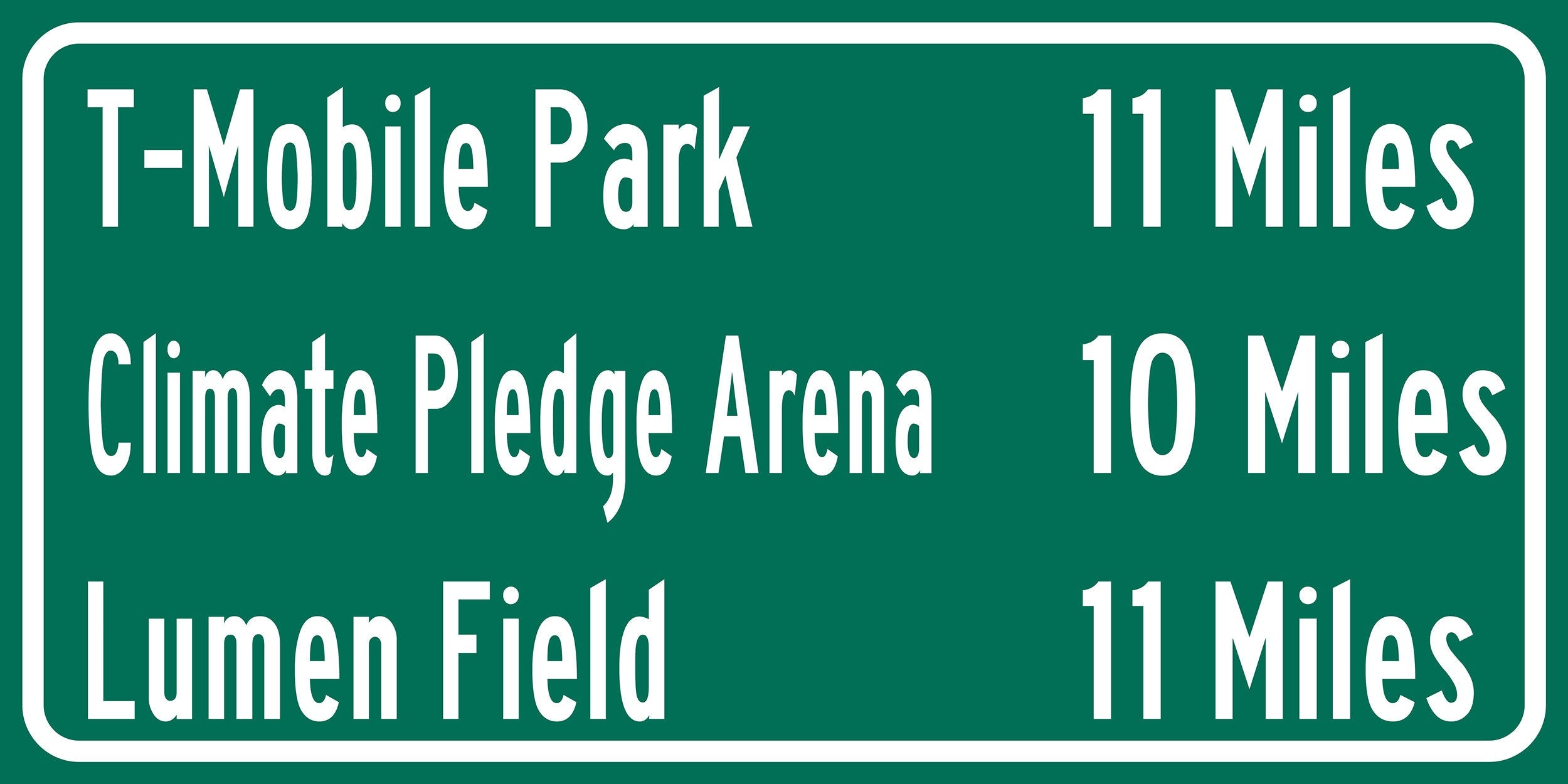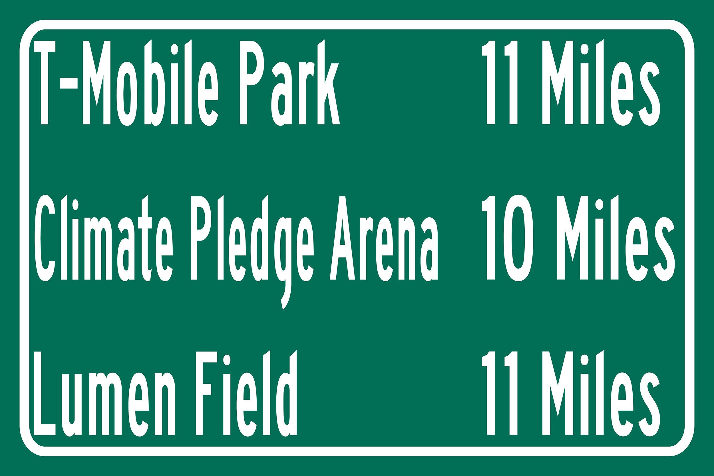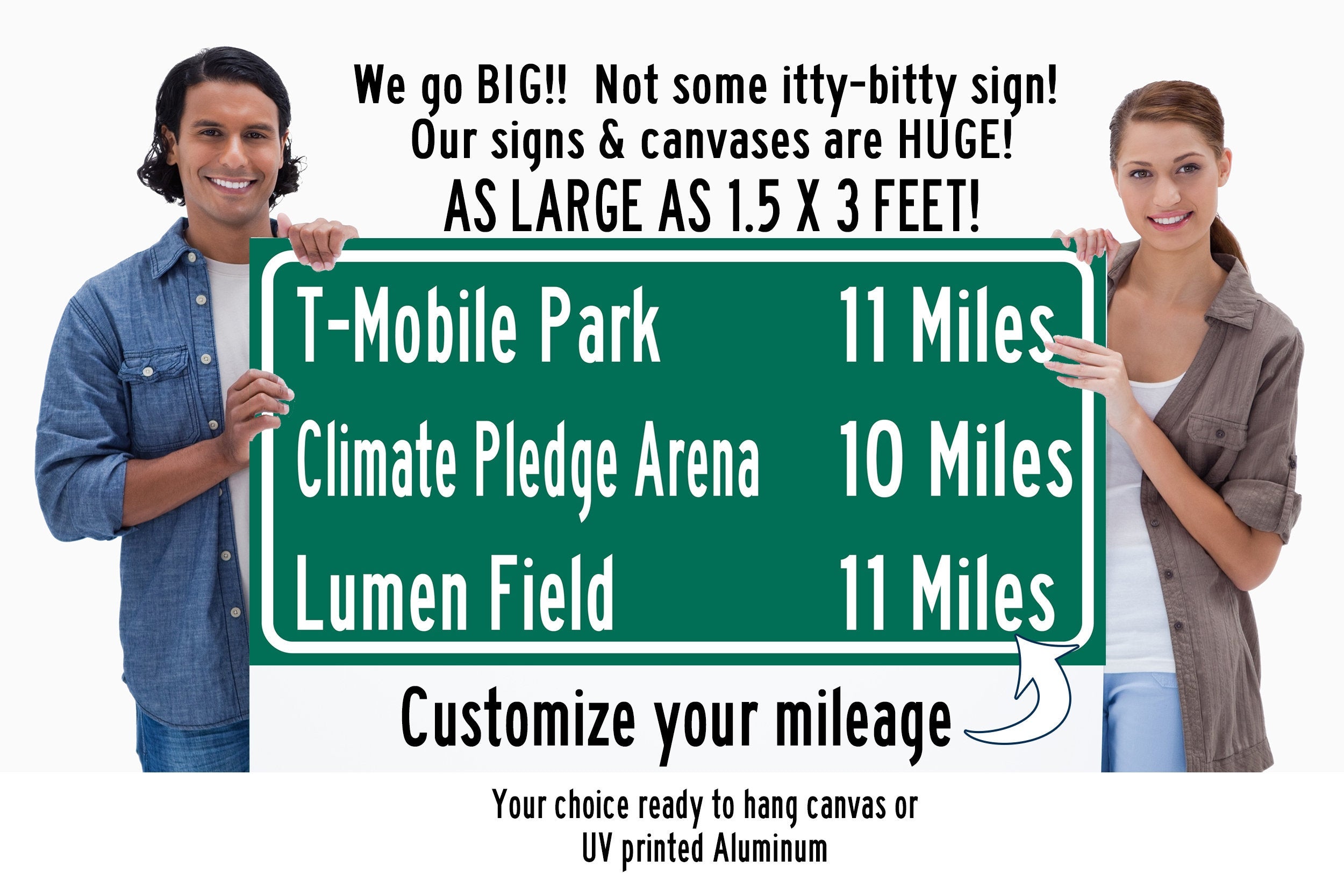 Personalized Highway Distance sign to all the Stadiums, Arenas and Ballparks in Seattle. Custom replica road sign, of the stadium made with real distance from you to the locations. WE GO HUGE!! Not some itty-bitty sign, Our signs are as large as 2 x 3 FEET! Seattle Sports Sign, T-Mobile Park, Lumen Field, Climate Pledge Arena