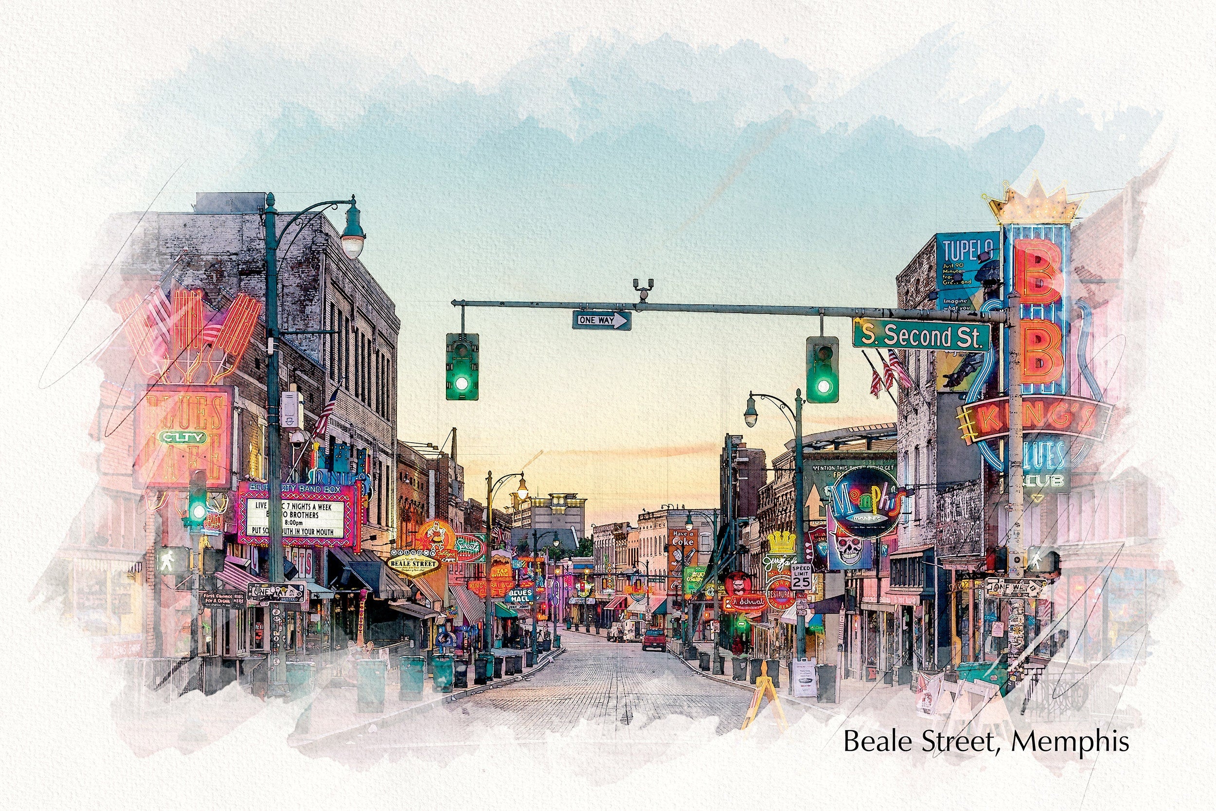 Stunning Watercolor Sketch of Beale Street in Memphis TN Great for a piece of wall art. Great for a piece of wall art. Available as a single canvas at 16″ x 24″ , 24″ x 36″ , or 32″ x 48″ or we can make you a special 3 panel work of art. Memphis watercolor wall art