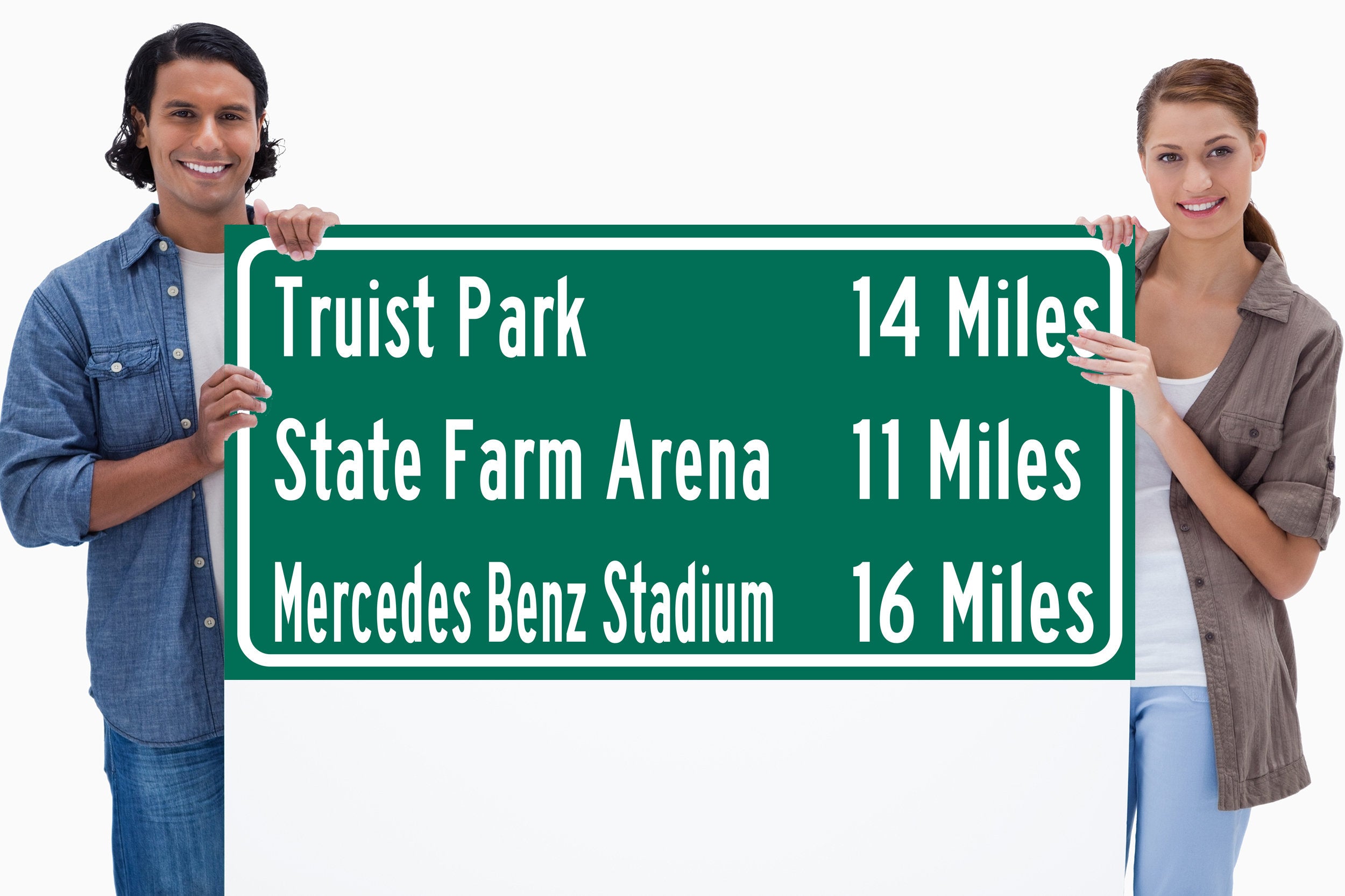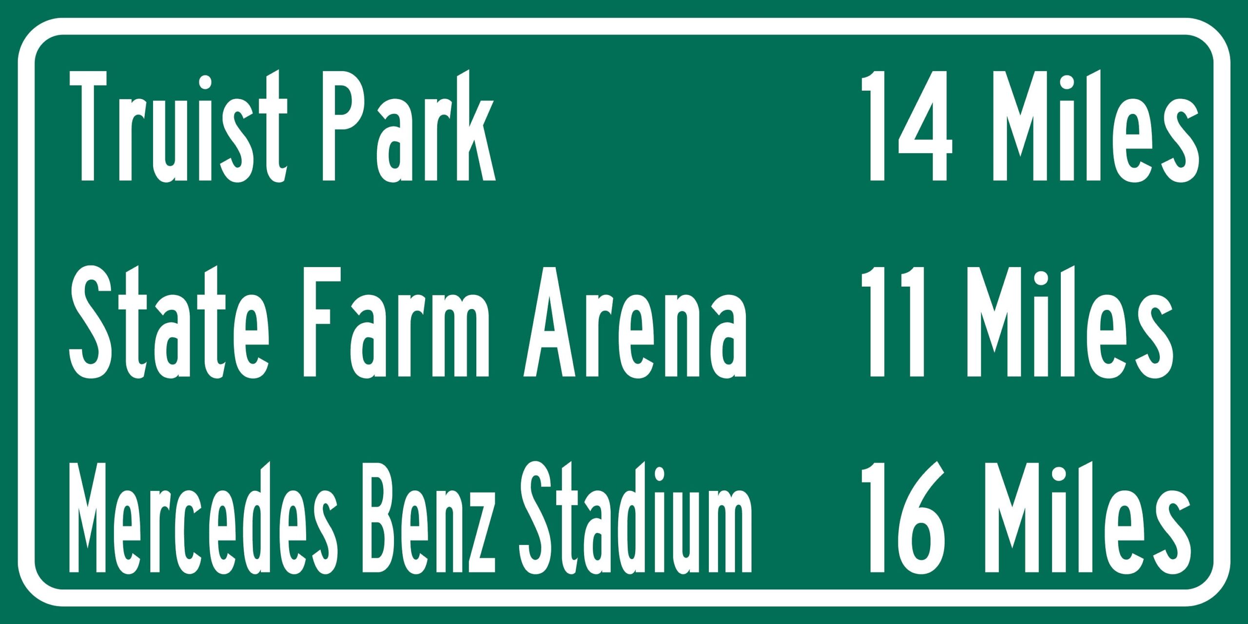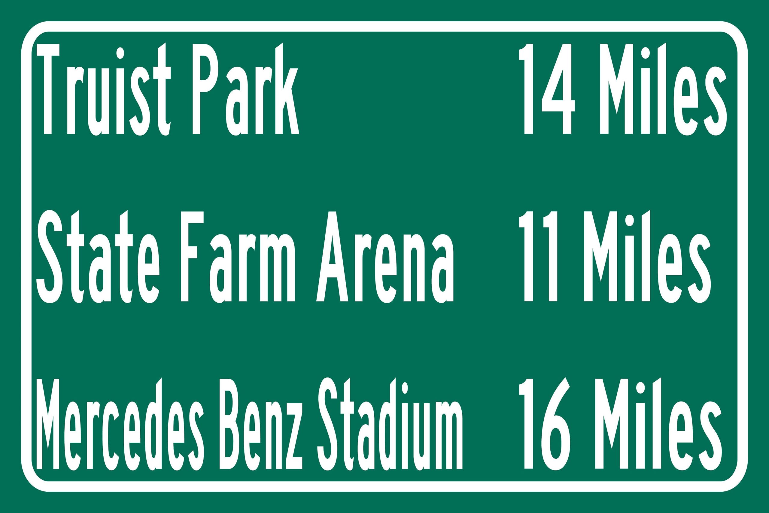 Personalized Highway Distance sign to all the Stadiums, Arenas and Ballparks in Atlanta. Custom replica road sign, of the stadium made with real distance from you to the locations. WE GO HUGE!! Not some itty-bitty sign, Our signs are as large as 2 x 3 FEET! Atlanta Sports Sign, Mercedes Benz Stadium Stadium, Truist Park, State Farm arena