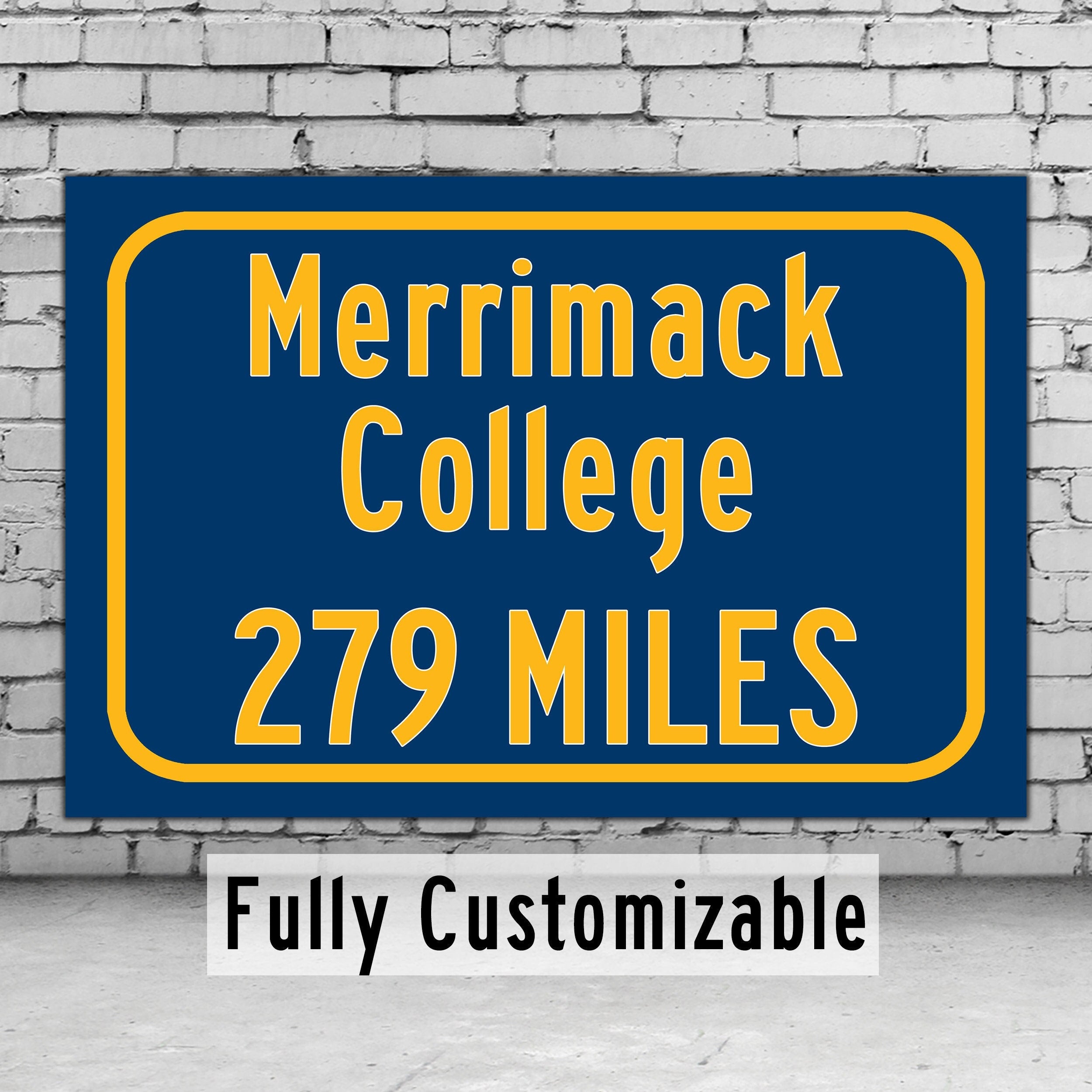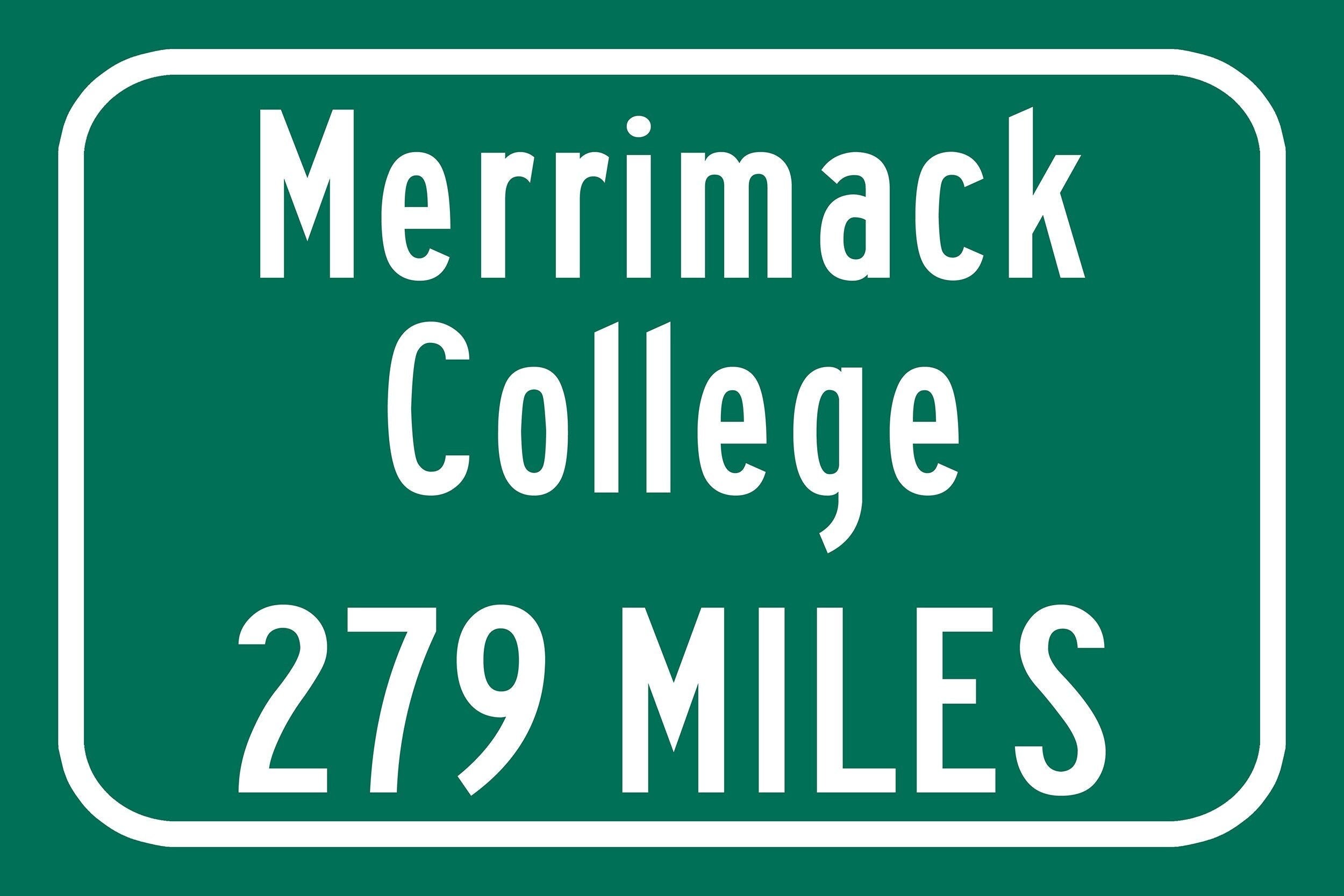 Personalized Highway Distance sign to Merrimack College / Merrimack Warriors / North Andover Massachusetts /
