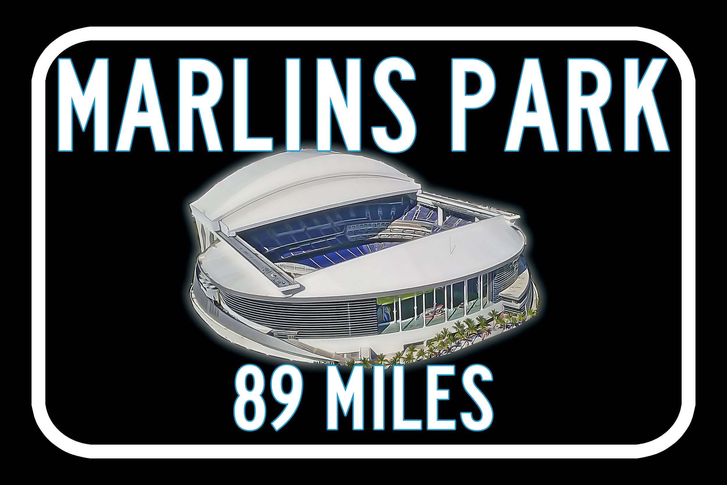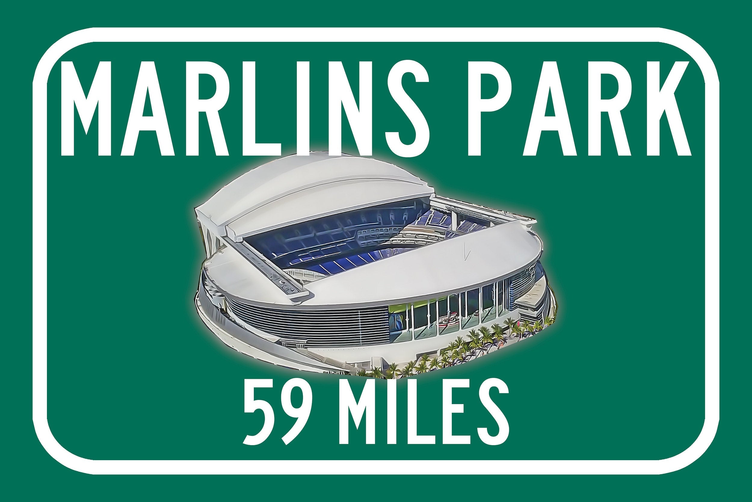 Personalized Highway Distance sign to Marlins park in Miami. Custom replica road sign, with a watercolor photo of the stadium made with real distance from you to Marlins Park. WE GO HUGE!! Not some itty-bitty sign, Our signs are as large as 2 x 3 FEET! Marlins Park highway sign. Miami Marlins Sign