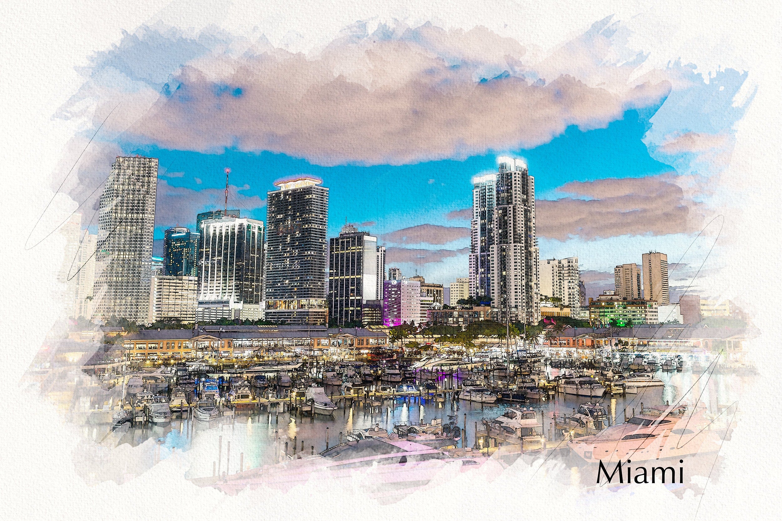 Great colorful watercolor on canvas of Miami Florida. Miami watercolor canvas Great for a piece of wall art. Available as a single canvas at 16″ x 24″ , 24″ x 36″ , or 32″ x 48″ or we can make you a special 3 panel work of art. or if you prefer, a digital download and you can print it your self. (no physical product sent) Miami Watercolor