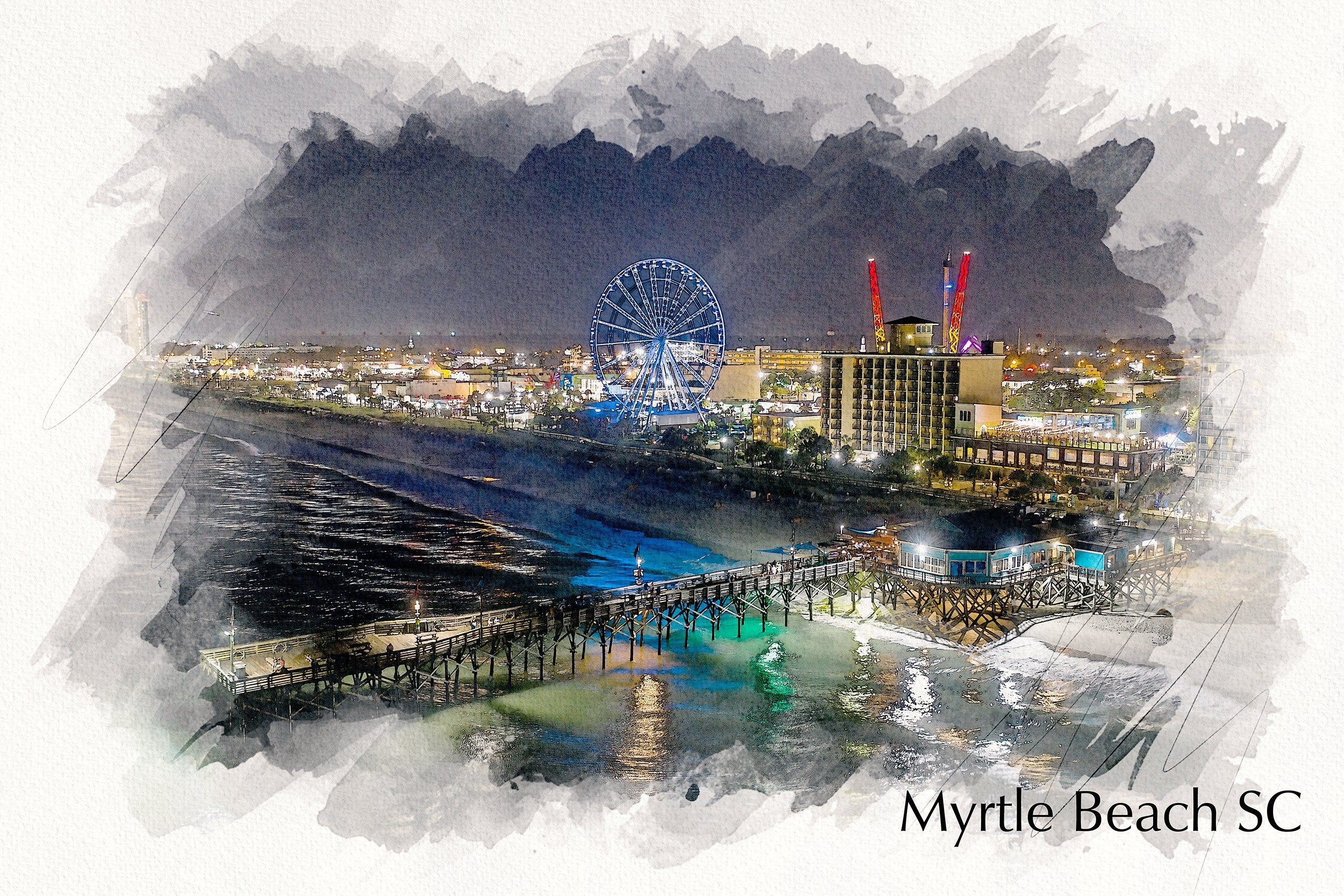 Great watercolor of Myrtle Beach on Canvas. Myrtle Beach watercolor Great for a piece of wall art. Available as a single canvas at 16″ x 24″ , 24″ x 36″ , or 32″ x 48″ or we can make you a special 3 panel work of art or purchase our digital download to print yourself (no product will be sent) South Carolina art