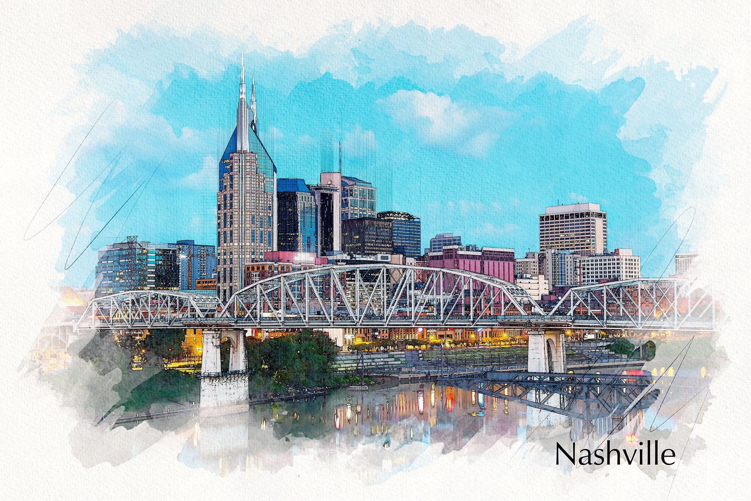 Stunning sketch watercolor print of the Nashville skyline . Nashville watercolor Great for a piece of wall art. Available as a single canvas at 16″ x 24″ , 24″ x 36″ , or 32″ x 48″ or we can make you a special 3 panel work of art or if you prefer, a digital download and you can print it your self. (no physical product sent)