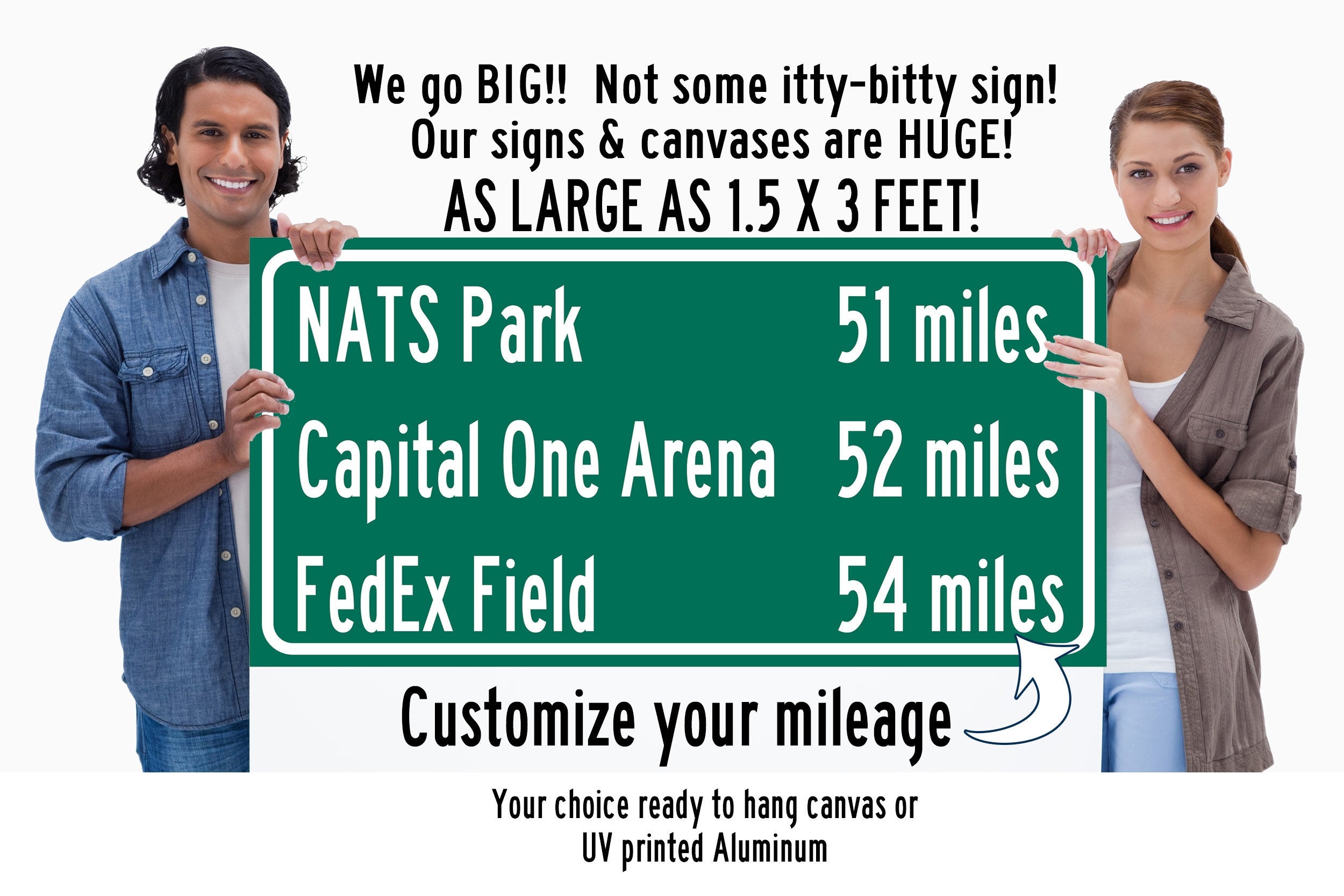 Personalized Highway Distance sign to all the Stadiums, Arenas and Ballparks in Washington. Custom replica road sign, of the stadium made with real distance from you to the locations. WE GO HUGE!! Not some itty-bitty sign, Our signs are as large as 2 x 3 FEET! Washington Sports Sign, Fed Ex Field, Nationals Park, Capital One arena