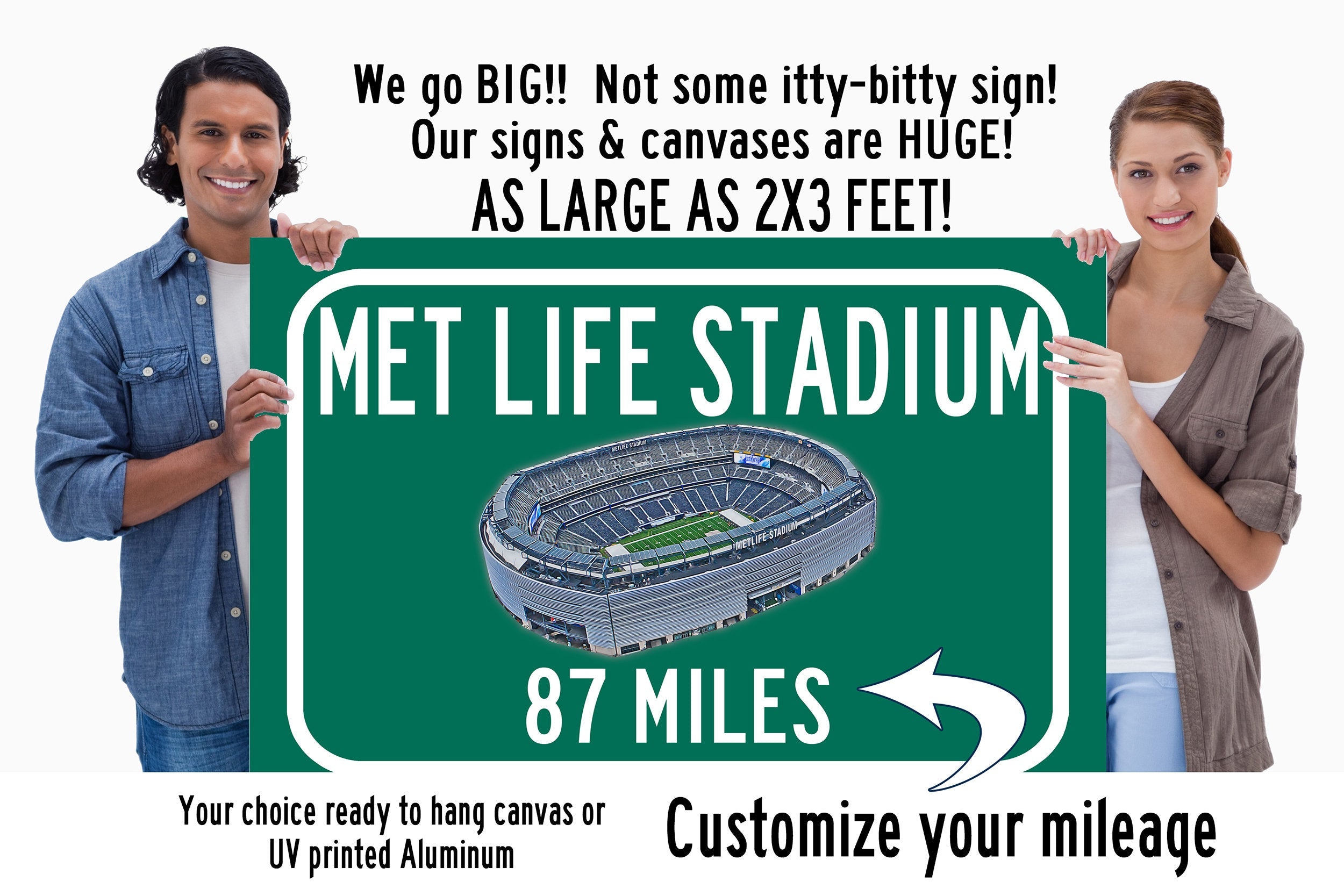 Personalized Highway Distance sign to MetLife Stadium in New jersey. Custom replica road sign, with a watercolor photo of the stadium made with real distance from you to MetLifeStadium. WE GO HUGE!! Not some itty-bitty sign, Our signs are as large as 2 x 3 FEET! MetLife Stadium highway sign. New York Jets sign