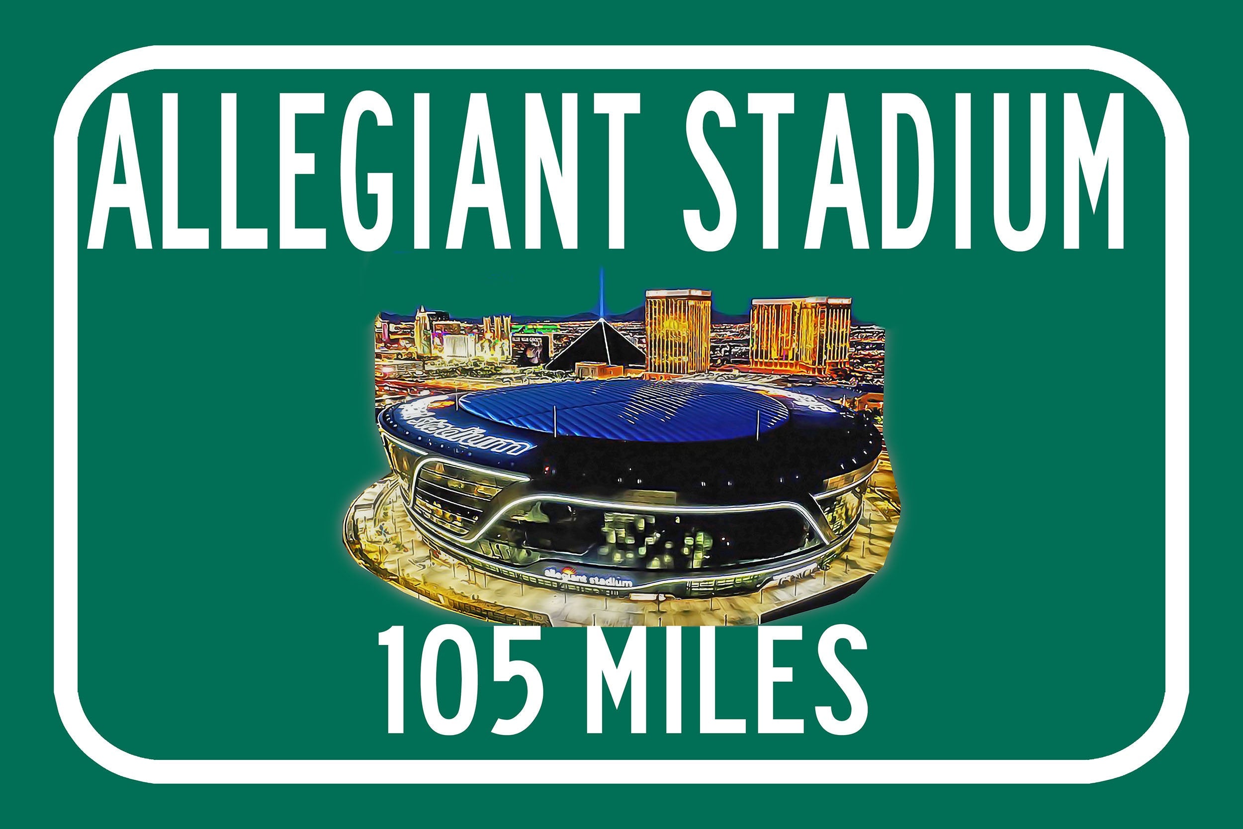 Personalized Highway Distance sign to Allegiant Stadium Las Vegas Raiders. Custom replica road sign, made with real distance from you to Allegiant Stadium Las Vegas Raiders. A unique gift for people who love the Las Vegas Raiders. Works in any home bar, garage, pool area, restaurants and bars, man-cave or she-shed and so much more. Allegiant Stadium Las Vegas Highway sign with mileage