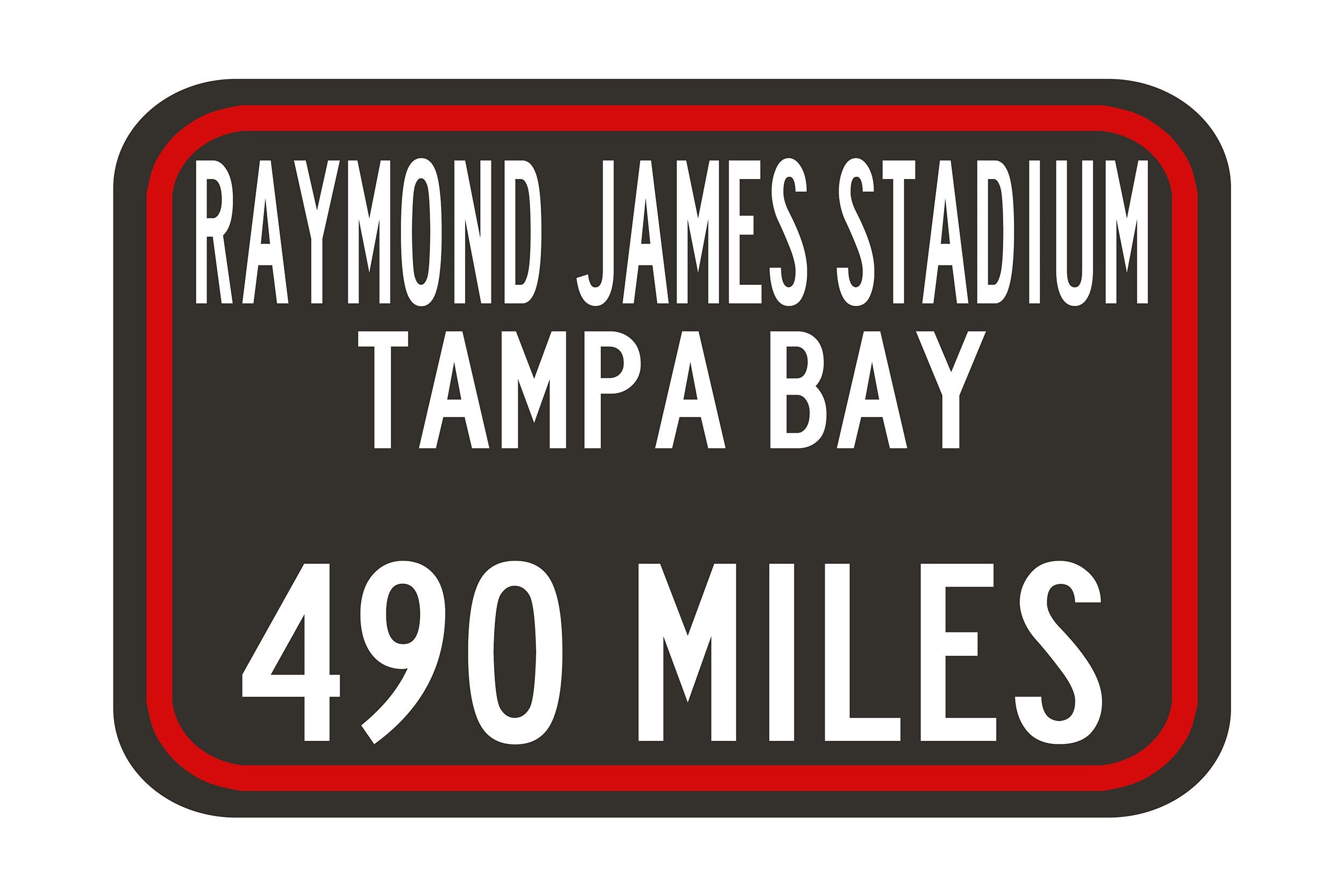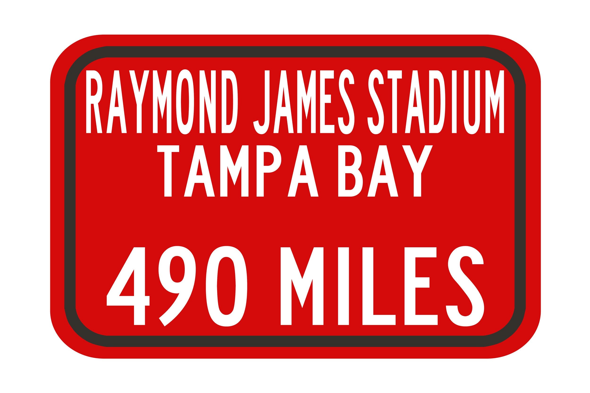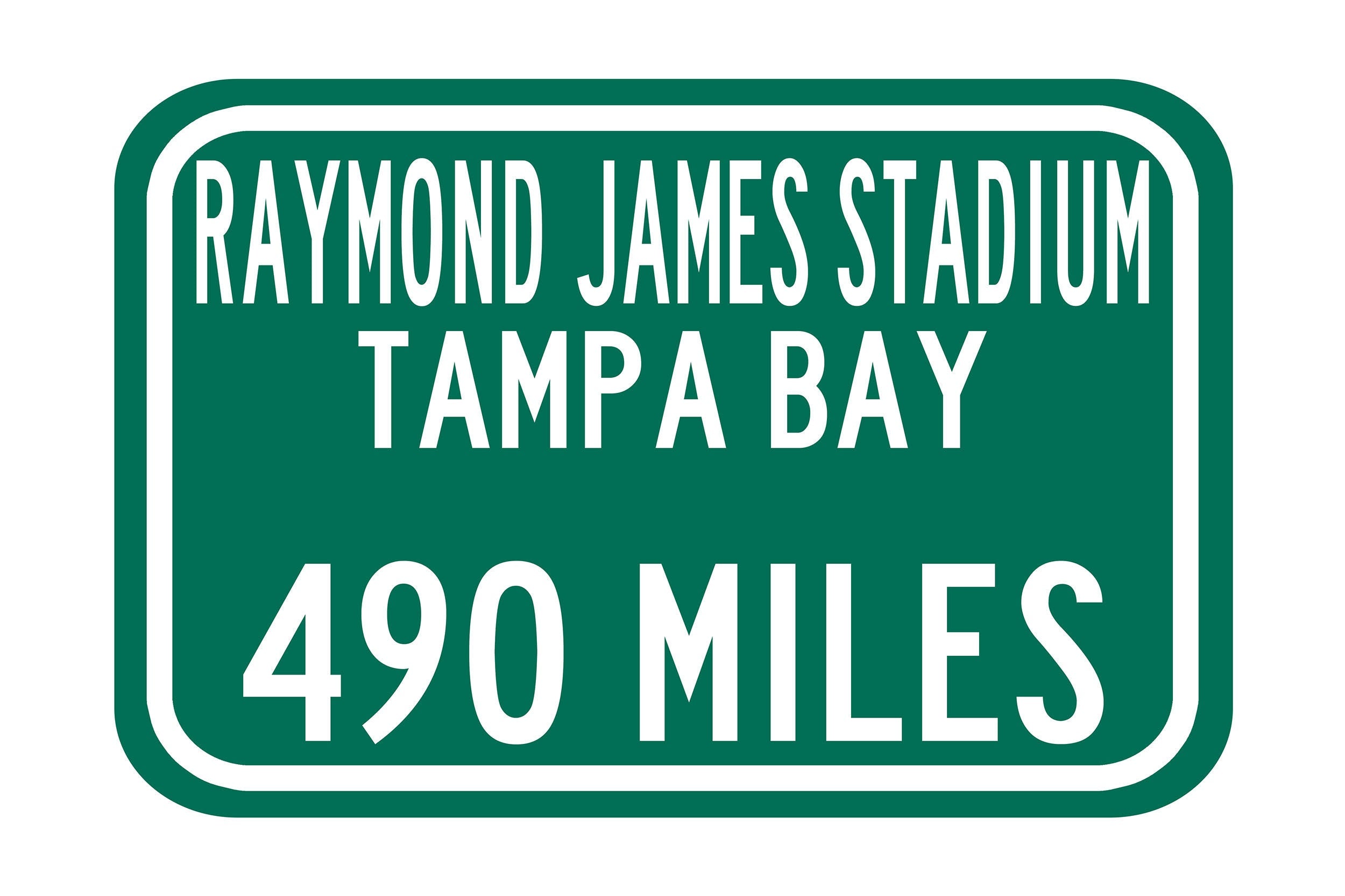 Personalized Highway Distance sign to Raymond James Stadium Tampa Bay Buccaneers . Custom replica road sign, made with real distance from you to Raymond James Stadium. Aluminum signs have holes to allow for easy hanging and Canvases are ready to hang. 12″ x 18″ Aluminum will have holes punched in the middle left and right and 24″ x 36″ will have holes in all 4 corners. Tampa Bay Super Bowl