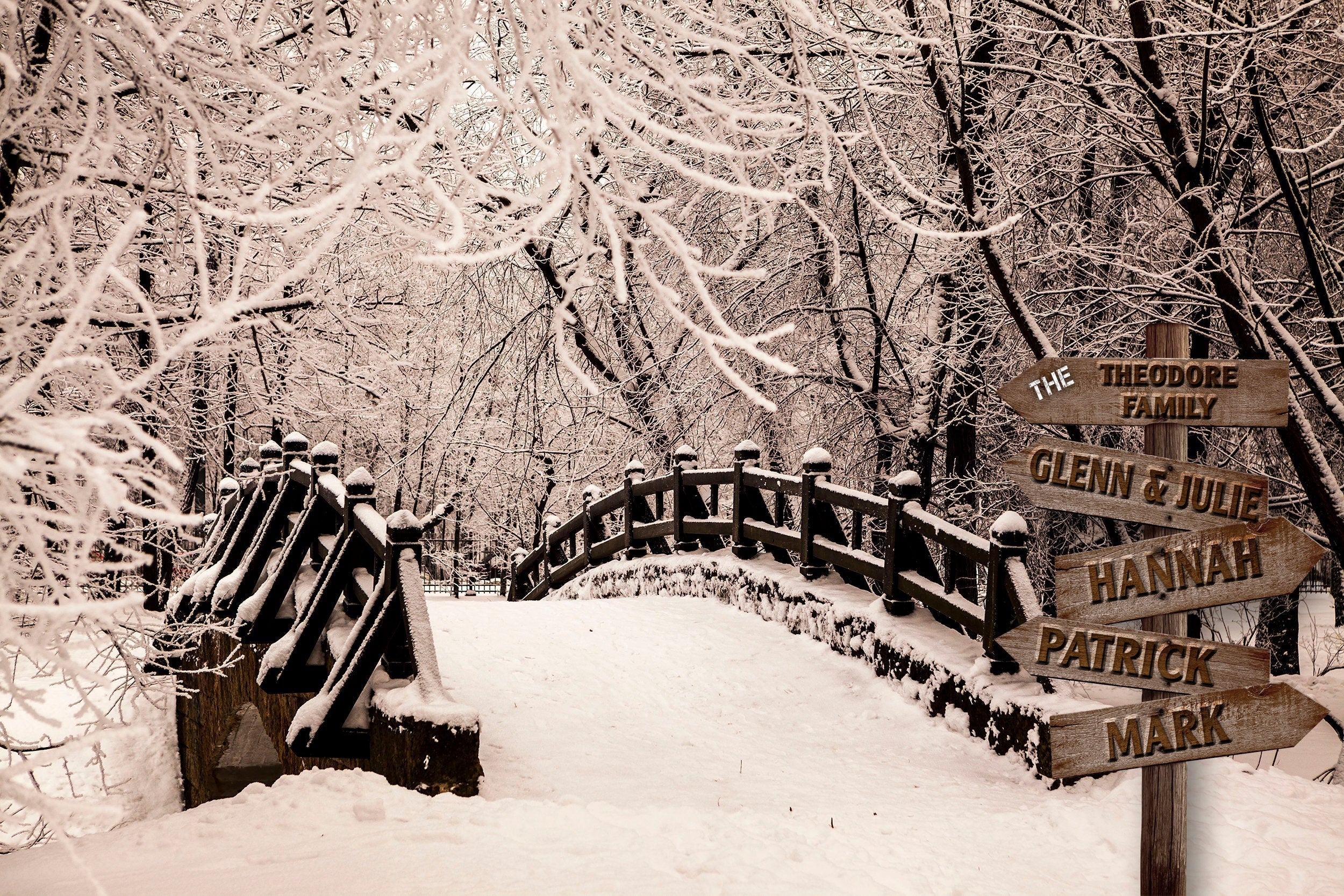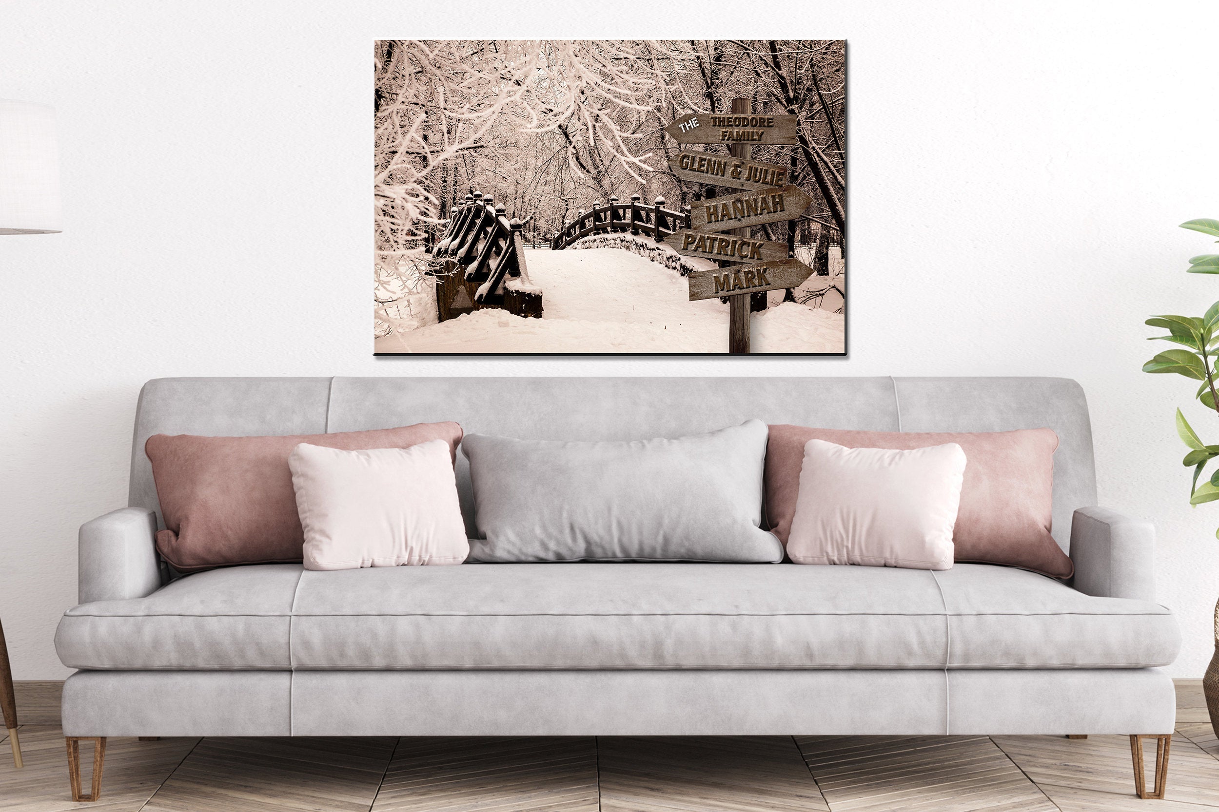 Personalized multi names on a snow covered bridge. This is a beautiful mounted canvas. This is a perfect family gift for those closest to you. Our fabulous print is customized with your family names. After ordering, leave personalization and check your email within 24 hours for a proof. We will not print until you approve the proof
