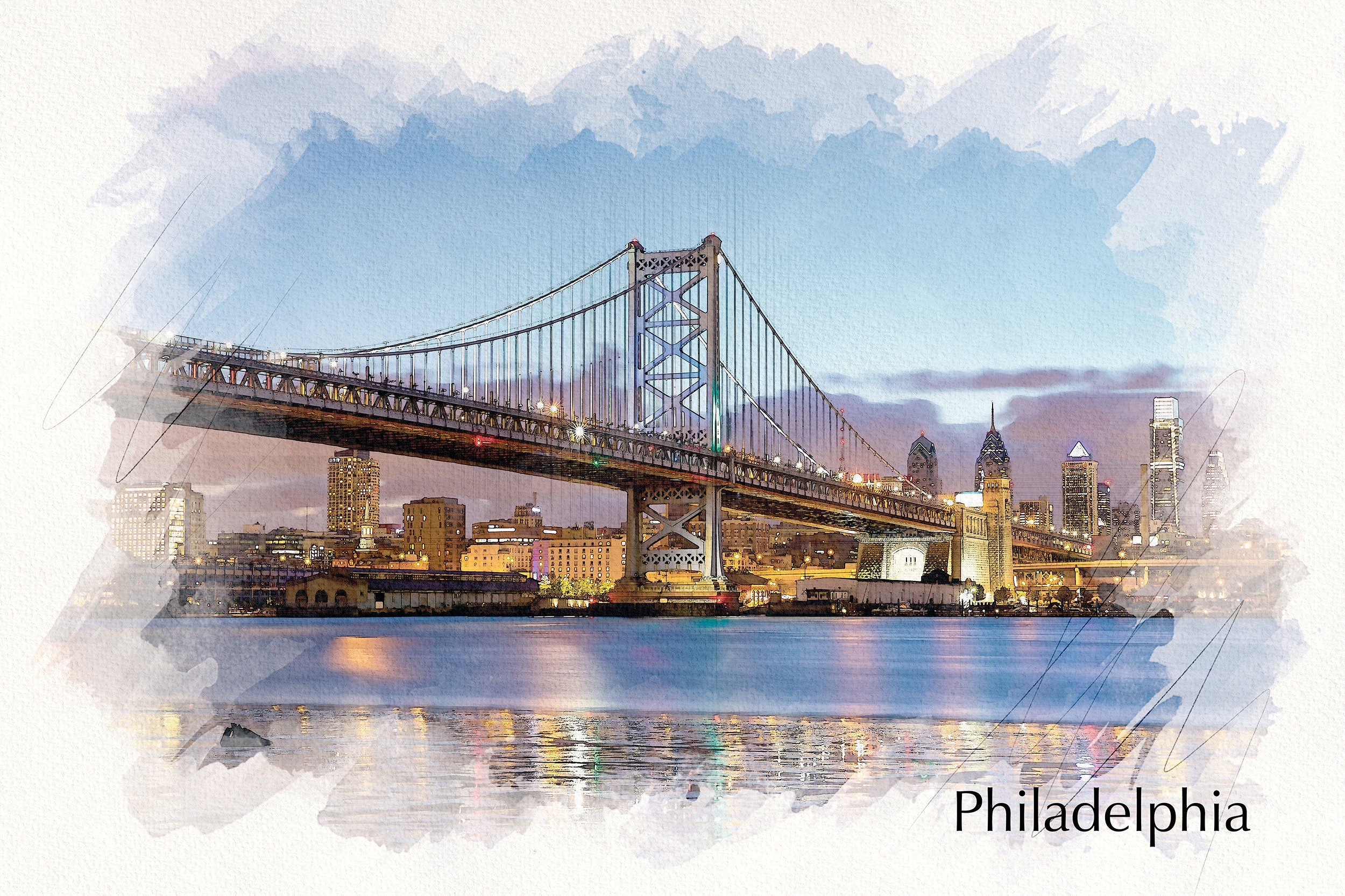 Stunning sketch watercolor of the Philadelphia Pennsylvania skyline from the Schuykill River. Philadelphia watercolor on canvas. Great for a piece of wall art. Available as a single canvas at 16″ x 24″ , 24″ x 36″ , or 32″ x 48″ or we can make you a special 3 panel work of art. Digital Download is available and you can print it yourself (no product will be shipped with digital download.