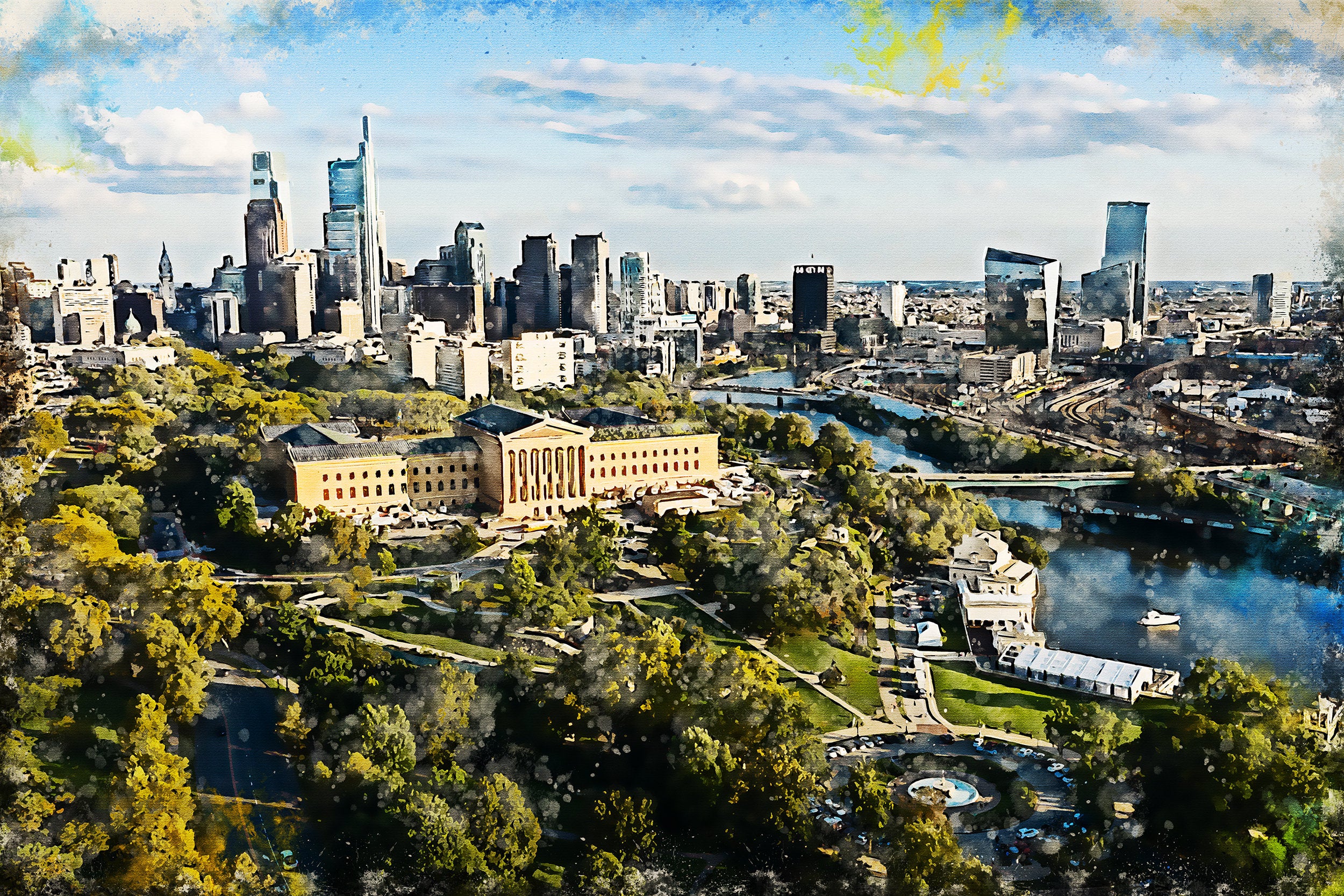 Stunning watercolor of the Philadelphia Pennsylvania skyline from the Schuykill River. Philadelphia watercolor on canvas. Great for a piece of wall art. Available as a single canvas at 16″ x 24″ , 24″ x 36″ , or 32″ x 48″ or we can make you a special 3 panel work of art as large as 4 x 8 foot wide. Digital Download is available and you can print it yourself (no product will be shipped with digital download.