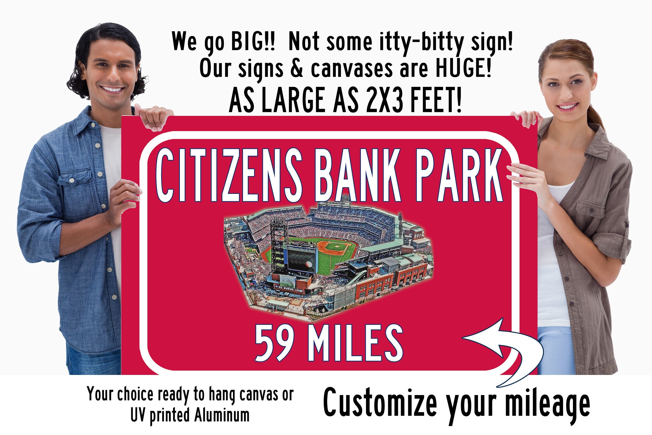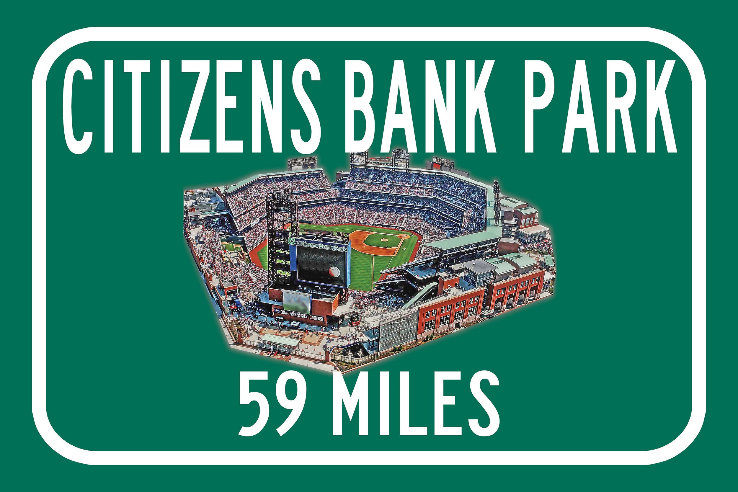 Personalized Highway Distance sign to Citizens Bank Park in Philadelphia. Custom replica road sign, with a watercolor photo of the stadium made with real distance from you to Citizens Bank Park HUGE!! Not some itty-bitty sign, Our signs are as large as 2 x 3 FEET! Citizens Bank Park. Philadelphia Phillies Sign